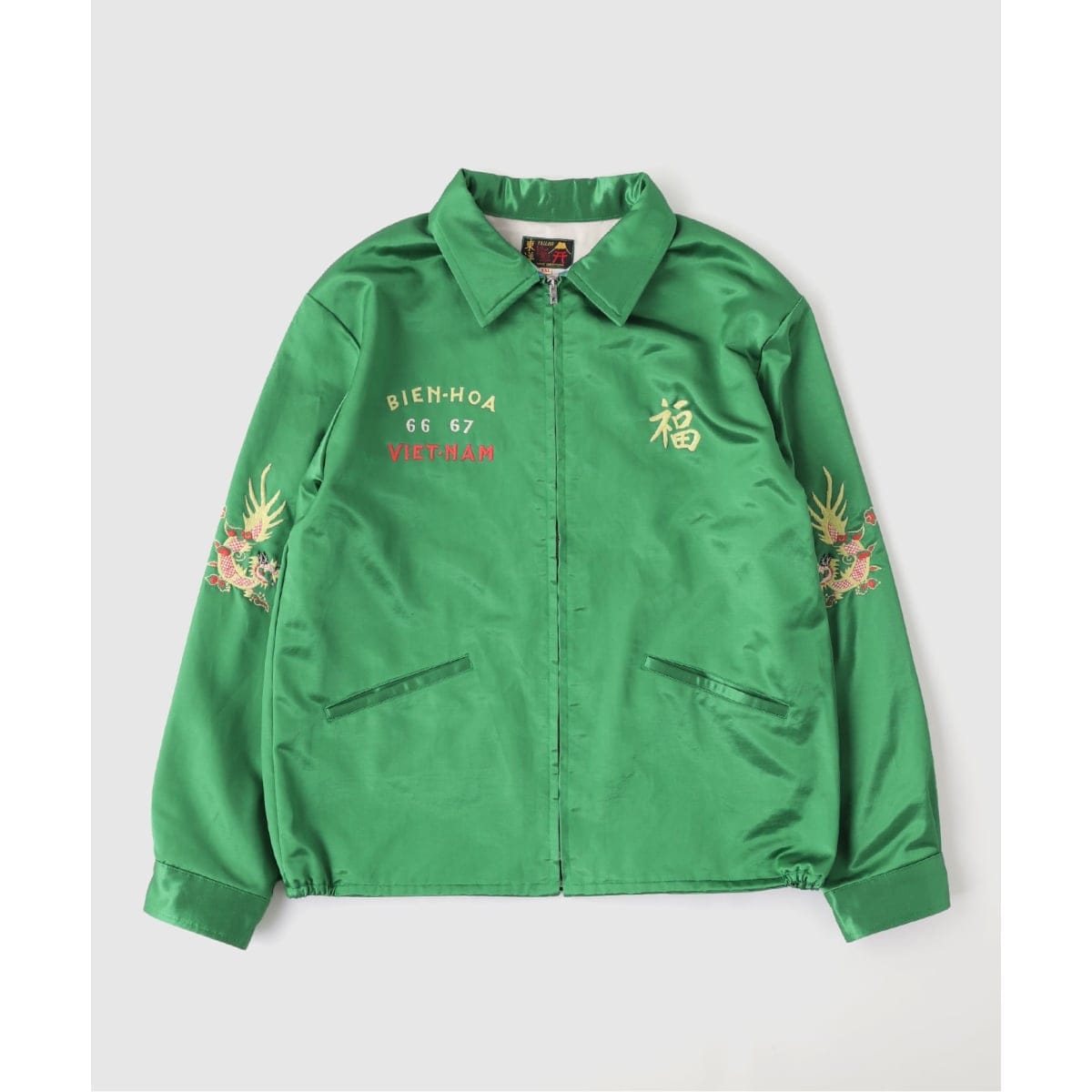 ヴィンテージでも非常に珍しいサテン生地のベトジャン。スカジャンとは異なるしなやかなサテン生地で仕立てられており、光沢感のあるボディとマットな刺繍糸のコントラストが美しい。1960年代中期(1966~67年)にベトナムの都市・BIEN HOA(ビエンホア)へ駐留していた米兵がカスタムオーダーで仕立てた一着を再現。背中にはパラシュート部隊の刺繍が施されている。袖口にはヴィンテージ同様、古銭を模したボタンを採用。ブラックに加え、爽やかなホワイトと色鮮やかなグリーンの配色も展開する。