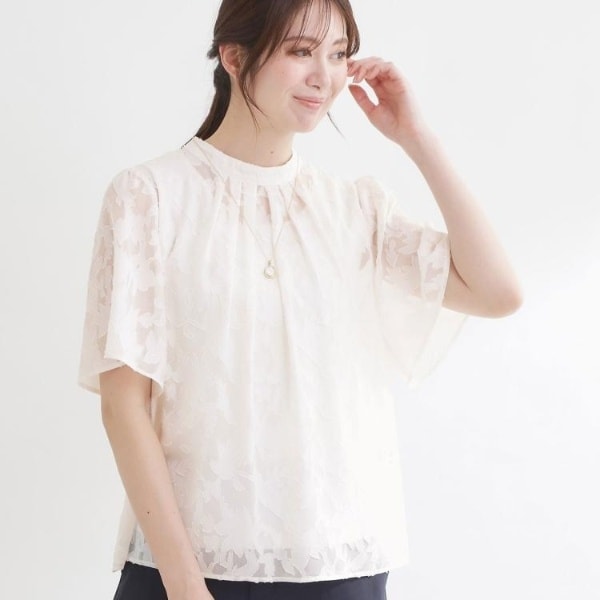 広すぎない衿ぐりと上品な低めのスタンドカラーで、袖は五分丈のフレア袖です。