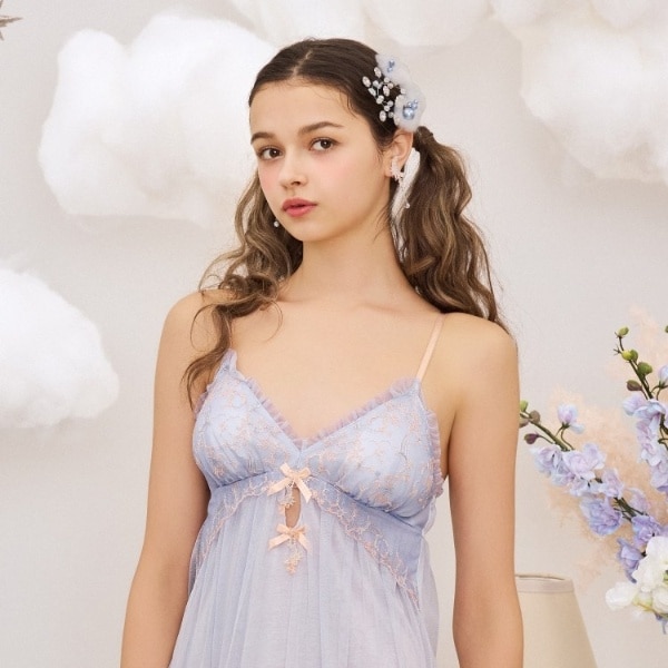 ペガサスとバンビが舞い踊る、夢の世界をイメージしたルームシリーズです。キラキラと降り注ぐ星や鮮やかな虹が織りなすレースで、まるで夢の中のようなロマンティックな可愛らしさに仕上がりました。カップ上辺と身生地にはギャザーチュールをふんだんにあしらい、ふわふわとしたディテールで世界観を後押し。リボン中央には月と星のアップリケを、裾は3段のチュールで切り替えて、特別感を演出しました。身に着けるだけで日常にちょっと魔法をかけるような、女の子の心ときめくコレクションです。