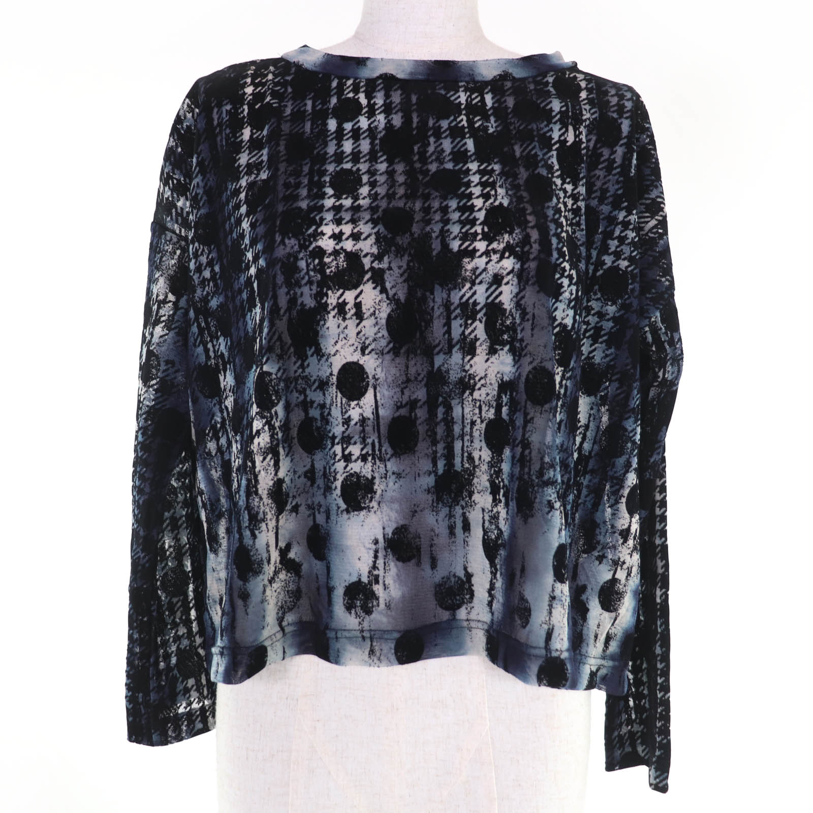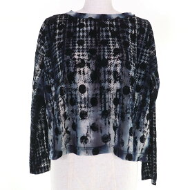 極美品☆Y's ワイズ YM-T19-676 千鳥格子 水玉 ドット柄 フロッキープリント 長袖 メッシュトップス カットソー ブルー 2 日本製 正規品 レディース【中古】