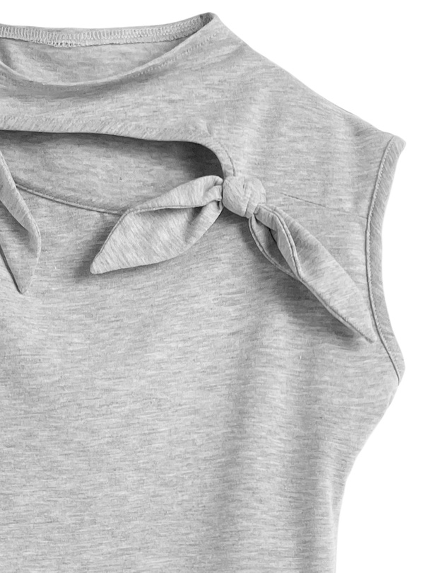 トップスは胸元のカットアウトとリボンがポイントになった女性らしいデザイン。