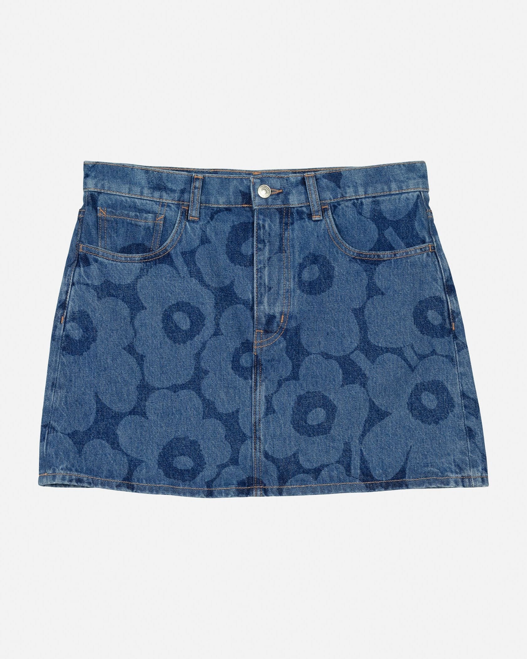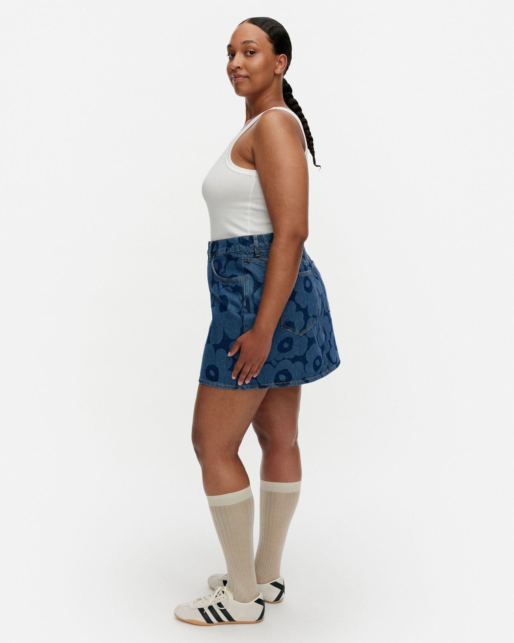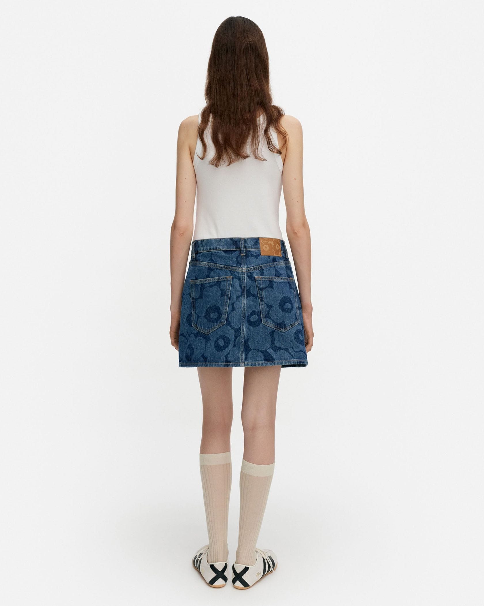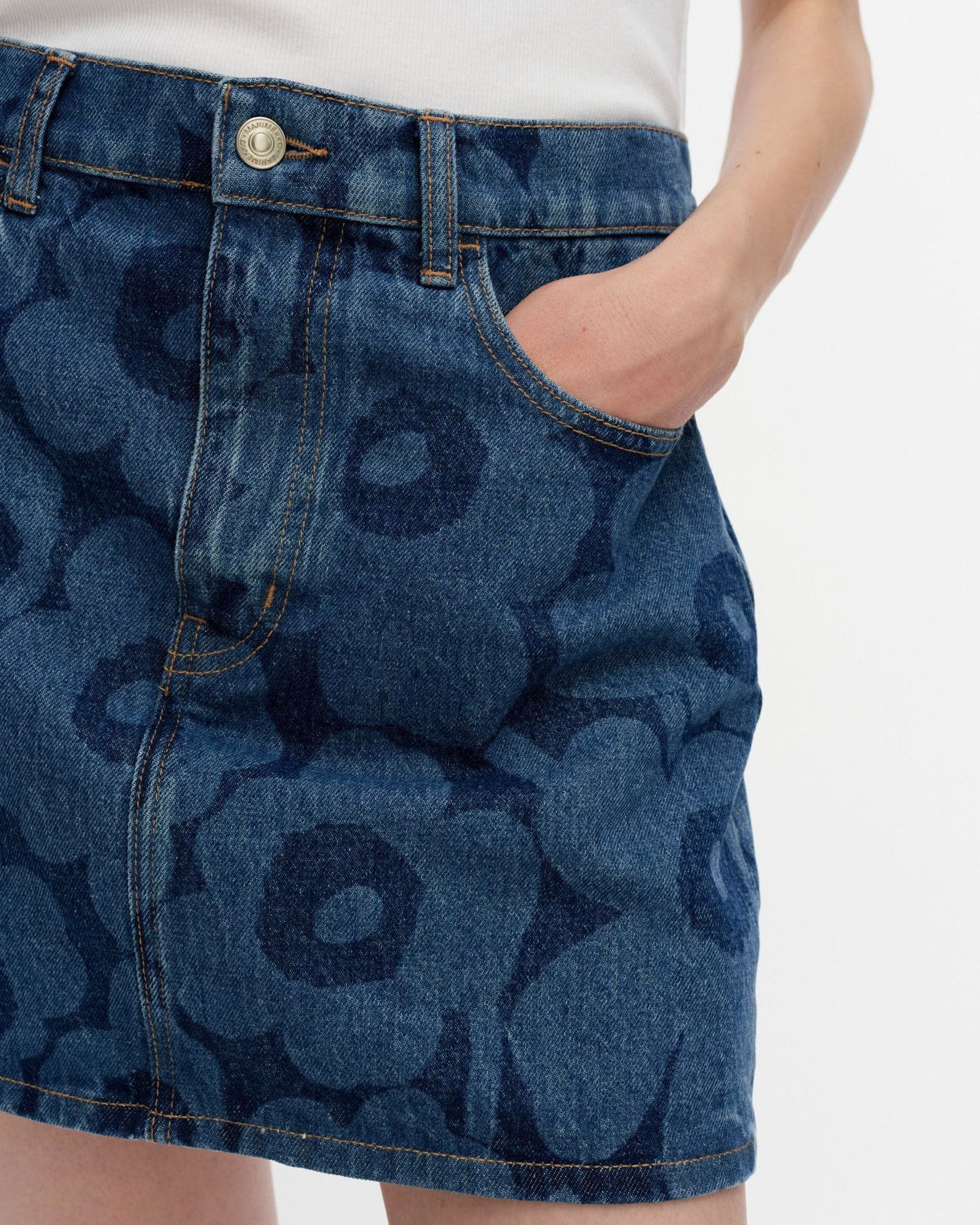 さりげなく主張するUnikko柄が可愛いデニムスカート。いつものカジュアルスタイルも、ワンランク華やかに仕上げてくれそう。アウターとのレイヤードを楽しむのもおすすめの一枚です。 マリメッコを取り扱っている一部のセレクトショップでは販売している場合がございます。