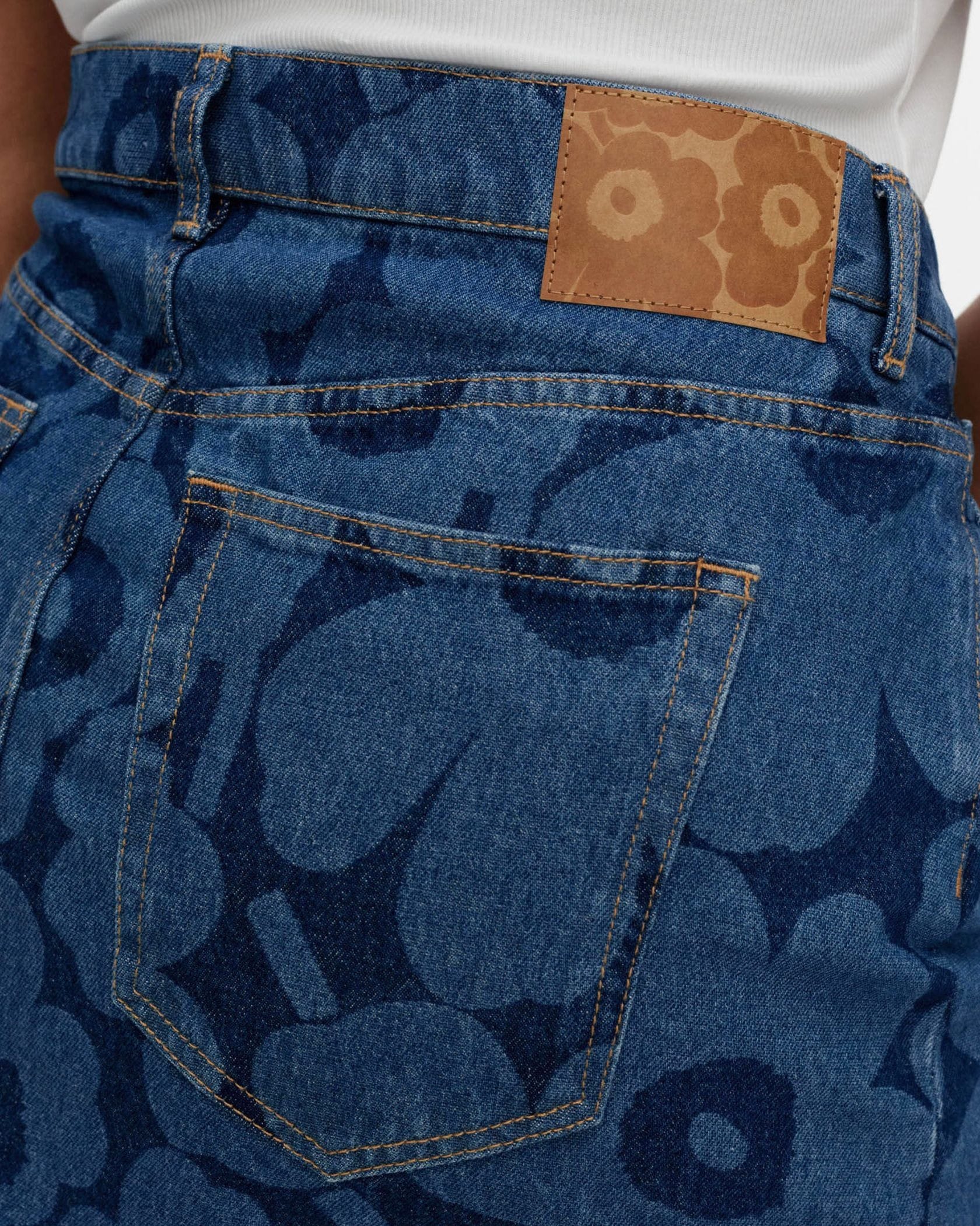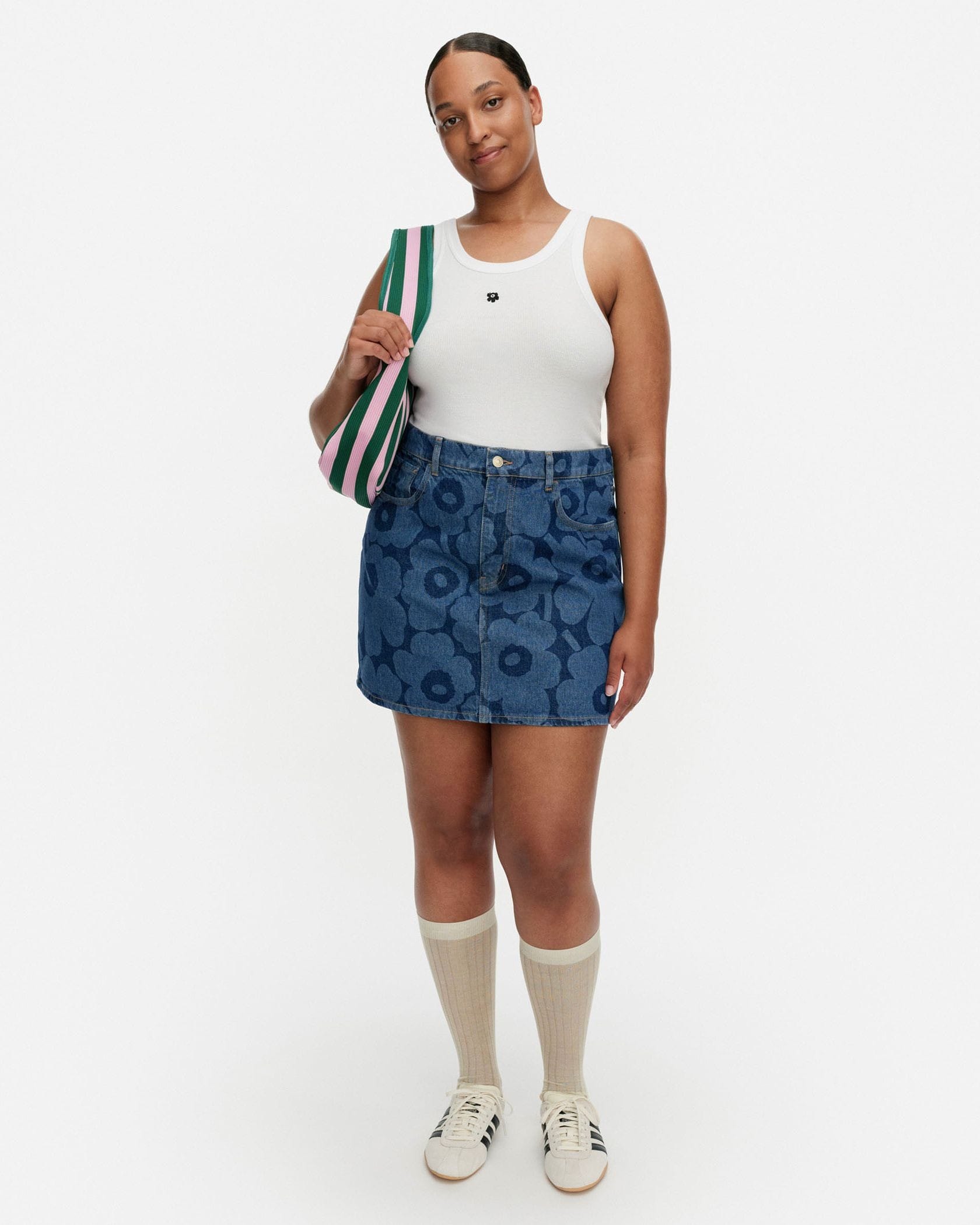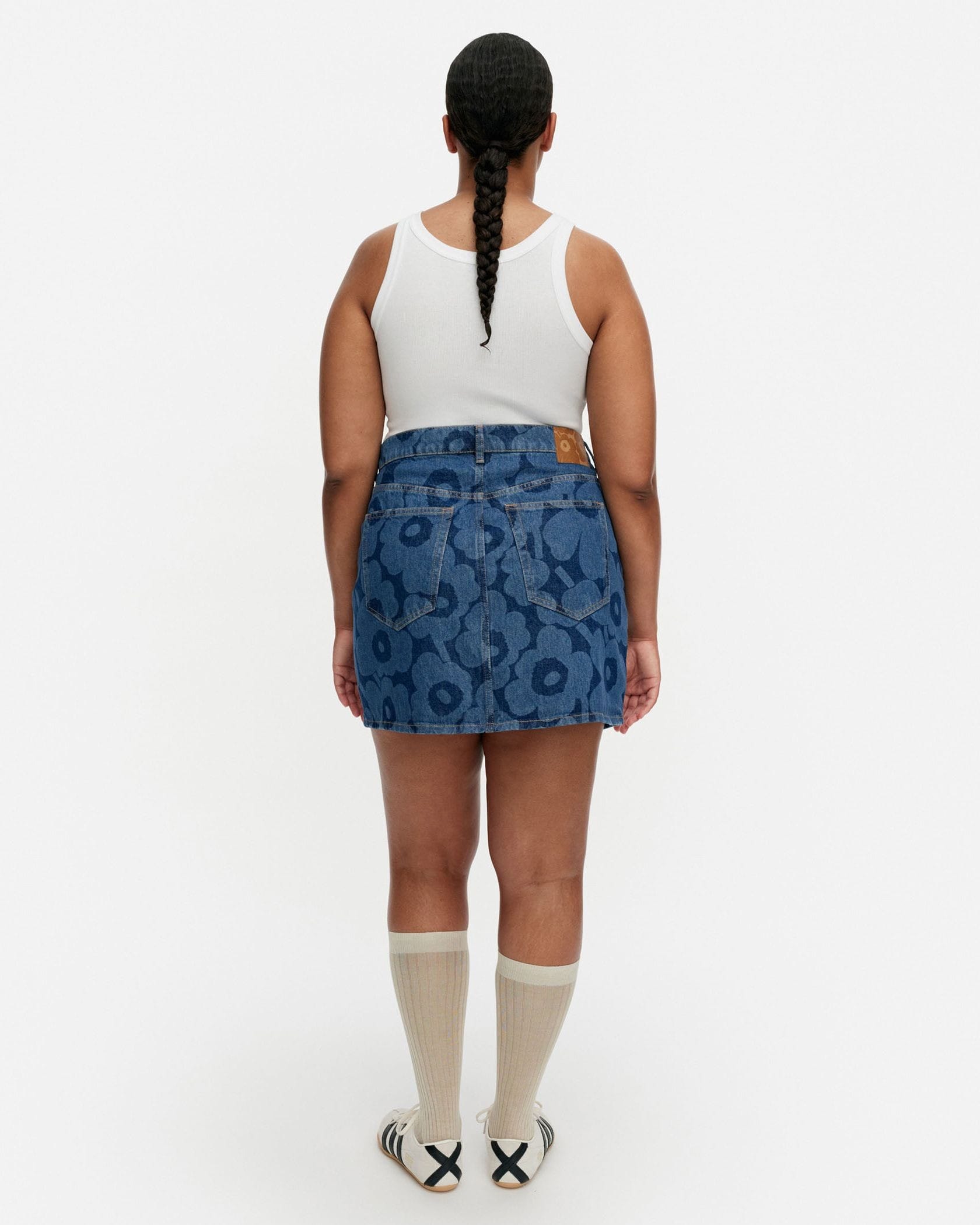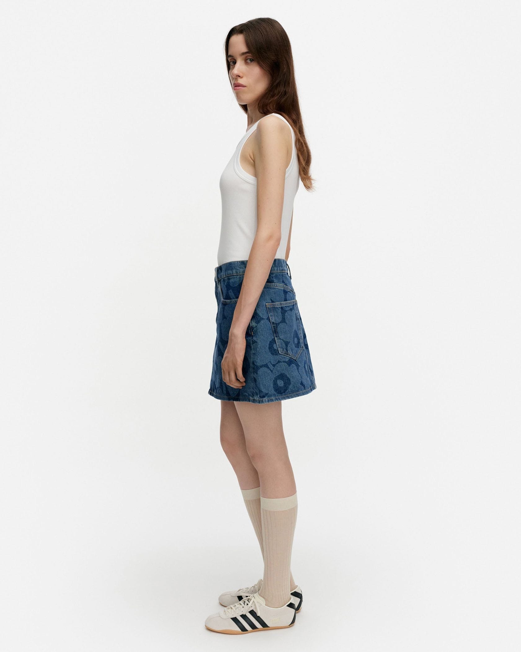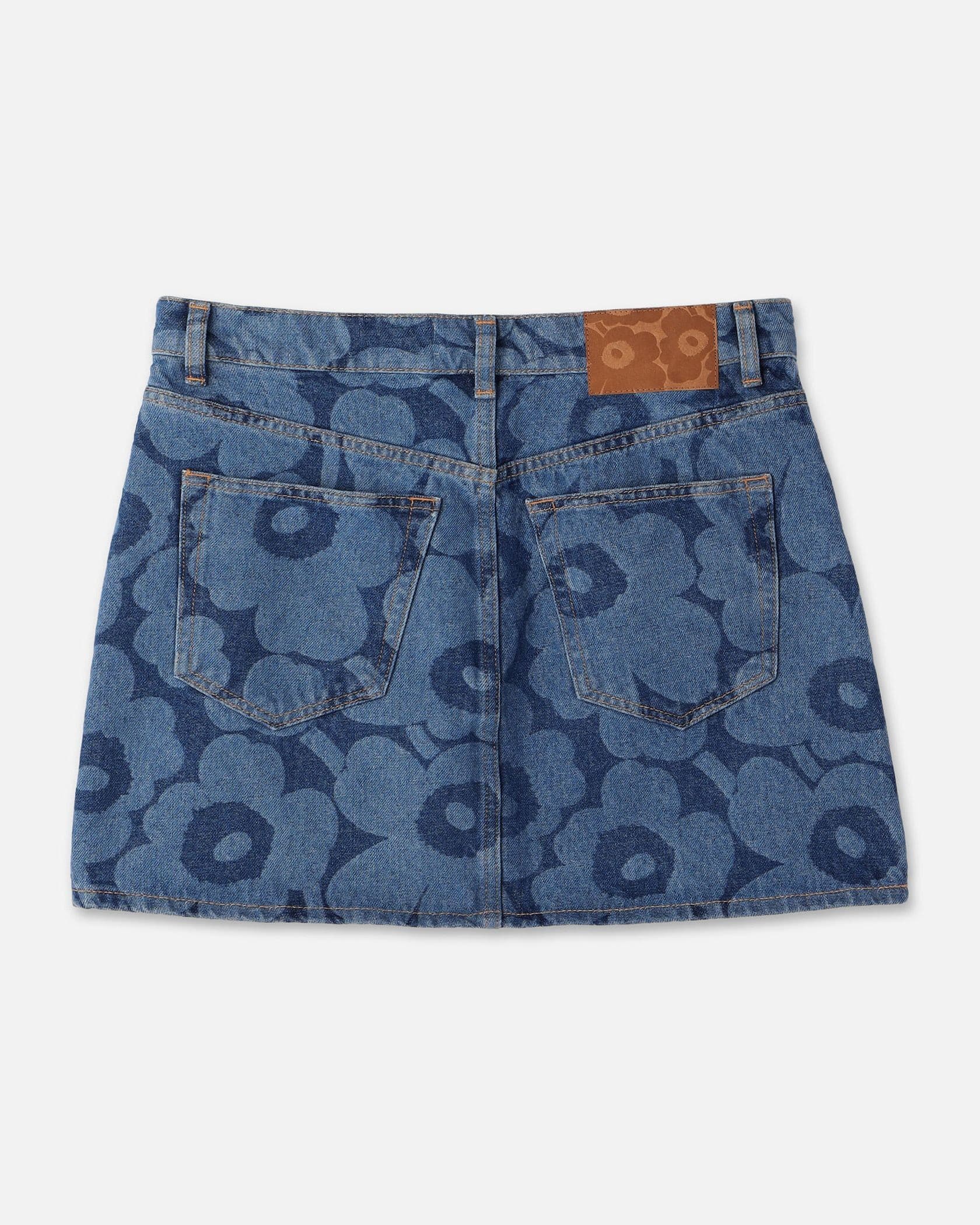 さりげなく主張するUnikko柄が可愛いデニムスカート。いつものカジュアルスタイルも、ワンランク華やかに仕上げてくれそう。アウターとのレイヤードを楽しむのもおすすめの一枚です。 マリメッコを取り扱っている一部のセレクトショップでは販売している場合がございます。