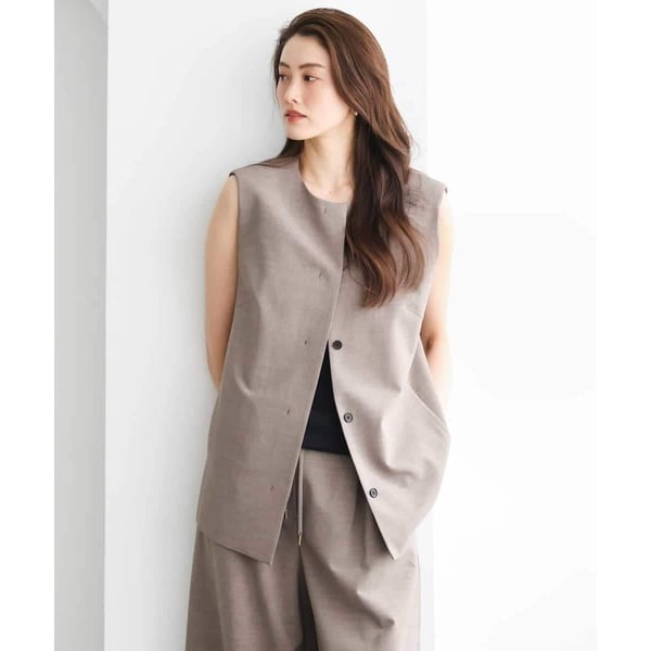 梳毛調トロピカル素材を使用したノーカラージレ。直線的なデザインに、ウエストから腰まわりにかけてやさしく沿うラインをプラスし、すっきりとしながらも女性らしいシルエットに仕上げています。程よくきちんと感があり、さりげなくハンサムな印象に。40サイズは限定店舗展開です。