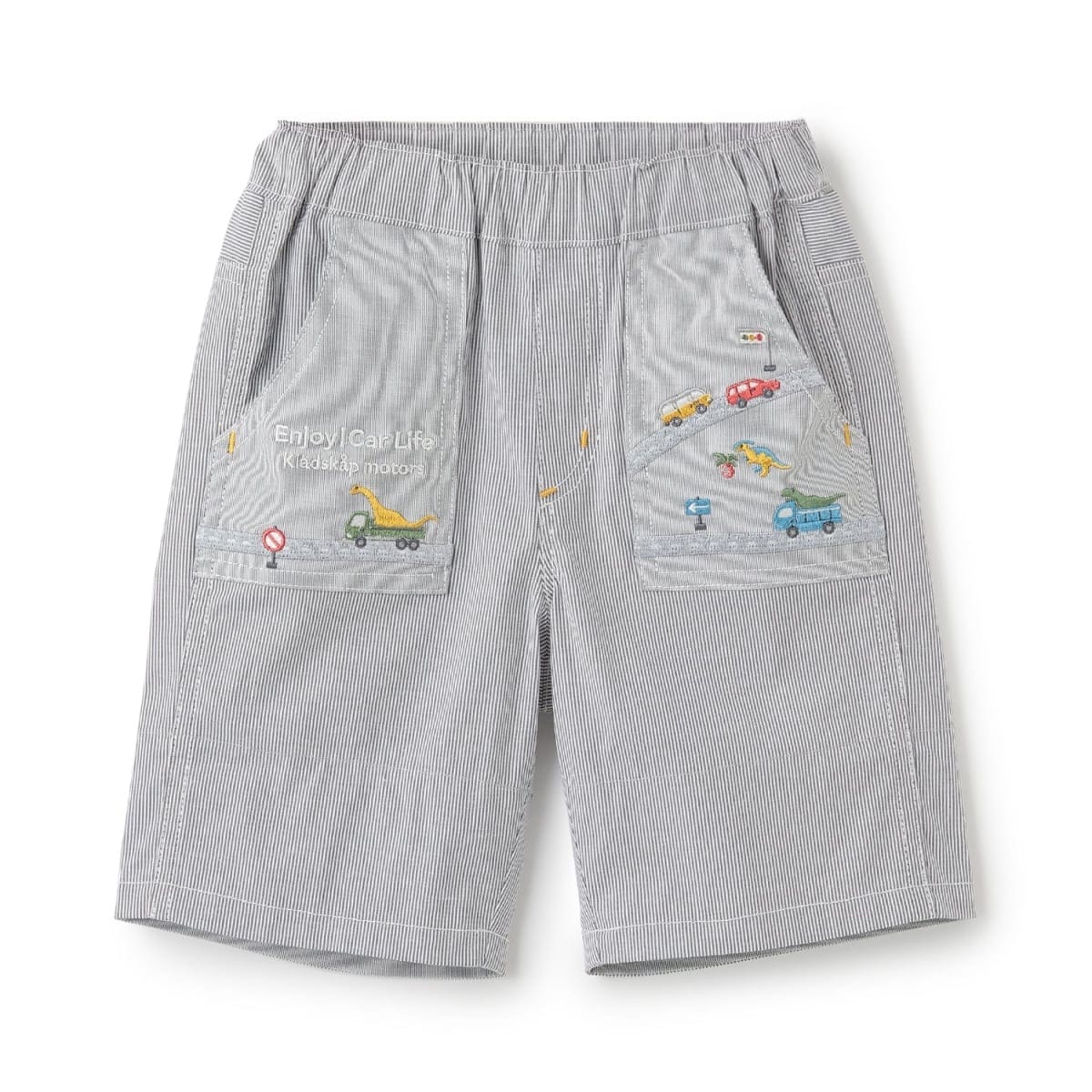 道を走る乗り物と恐竜さんが刺しゅうされた5分丈パンツです。