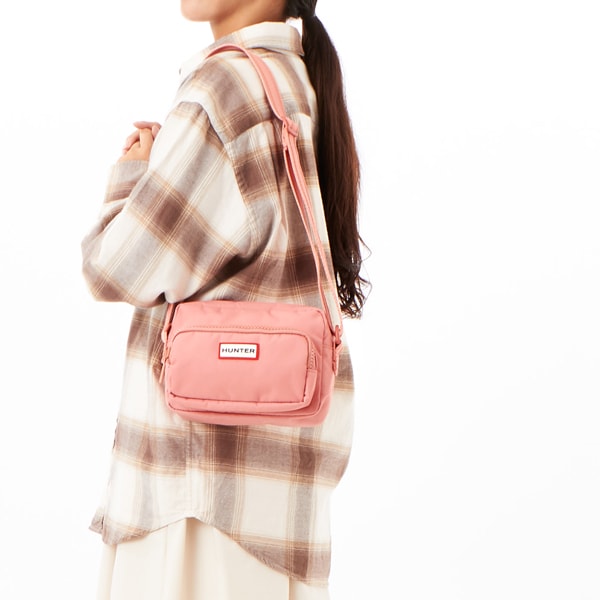 耐水性のリサイクルナイロン、裏地にはリサイクルポリエステルを使用しています。ストラップは長さ調節が可能で、クリップ部分にはハンターのシグネチャーがエンボス加工で施されています。