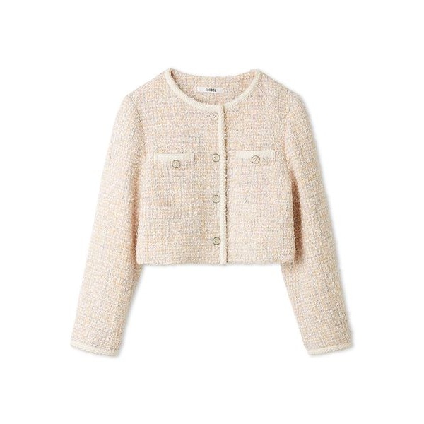 ふわふわキラキラとした華やかなオリジナルファンシーヤーンでお作りした、大人の甘さが魅力のツイードジャケットが届きました。春気分を先取りできる爽やかなカラーが目をひくアイテムです。端のブレードテープや、フロントの貝調ボタンが今季らしいクラシカルなデザイン。少し着丈が短めで、ボリュームのあるボトムスとも合わせやすく、今季らしいバランスが手に入ります。少しハイウエストでお作りしたツイードフレアミニスカート(SWFS261044)と同素材を使用しており、セットアップでのご着用もおすすめです。裏地付き。サイドにポケットが付いています。胸元のポケットはデザインです。