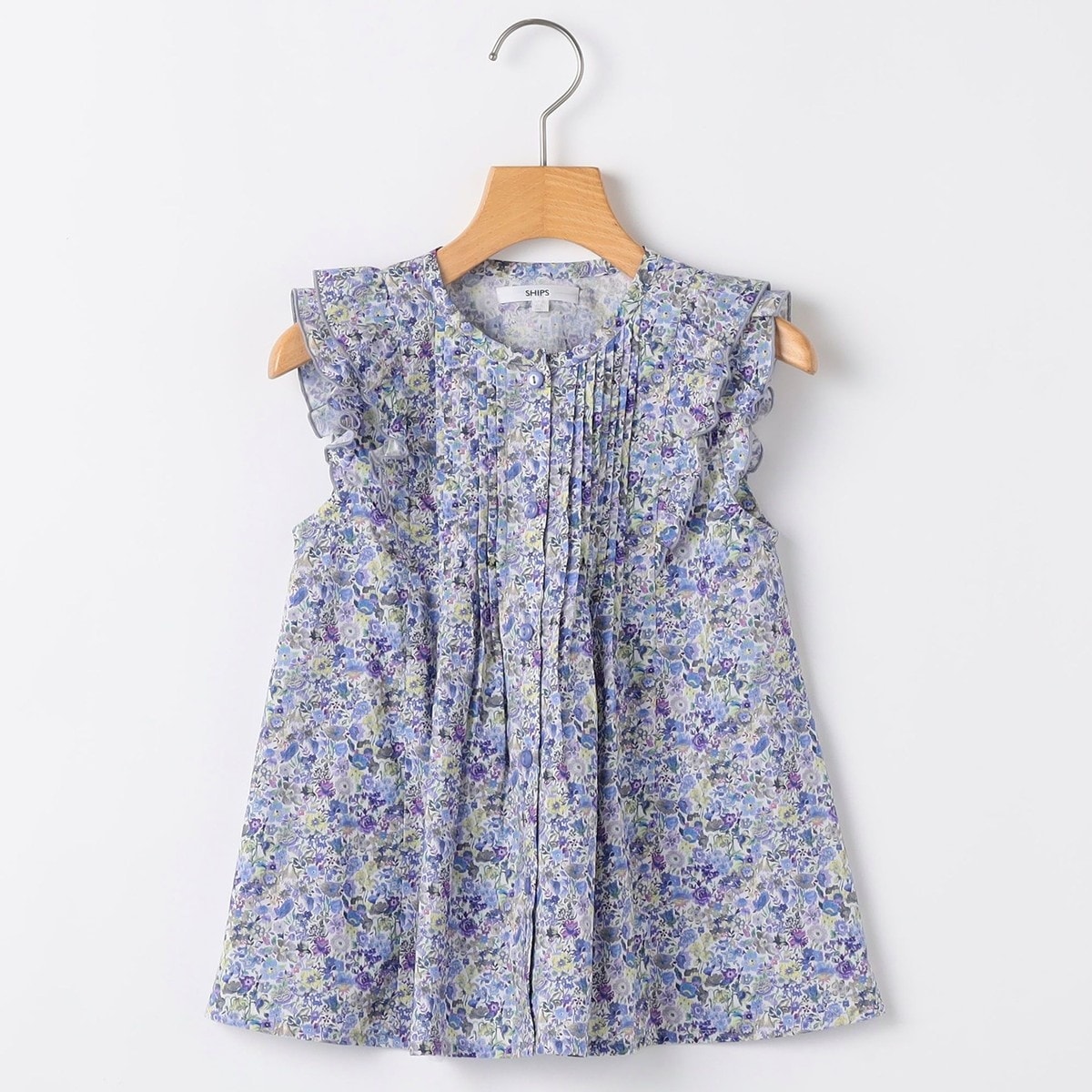 リバティファブリックを使用したコットン100%のフリルスリーブデザインのブラウス。