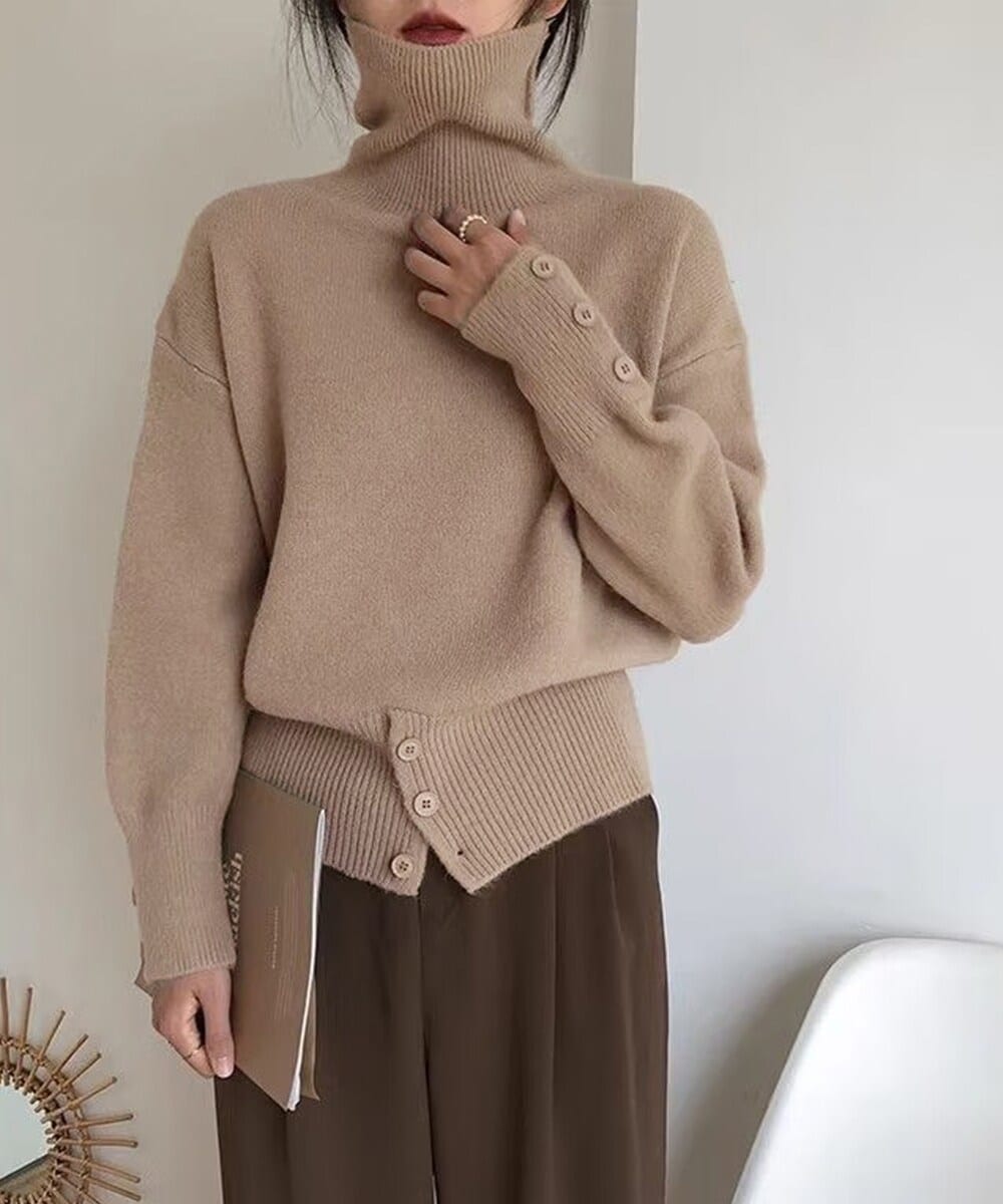 ボタンデザインがアクセントになったタートルネックニットプルオーバー。