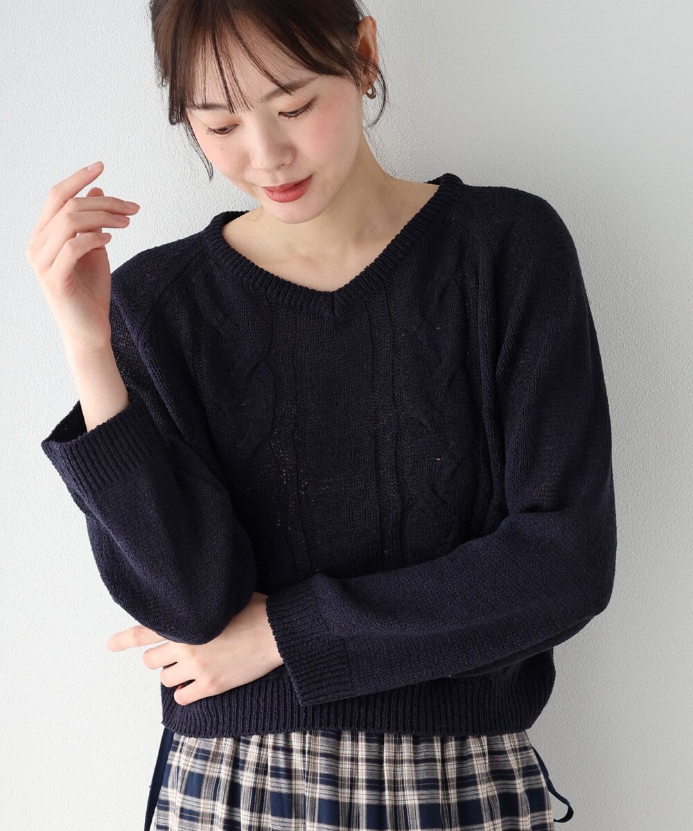 クラシカルなケーブル編みの表情を、軽やかな透け感のあるメッシュニットで表現した、今季らしいニュアンス溢れる一着。