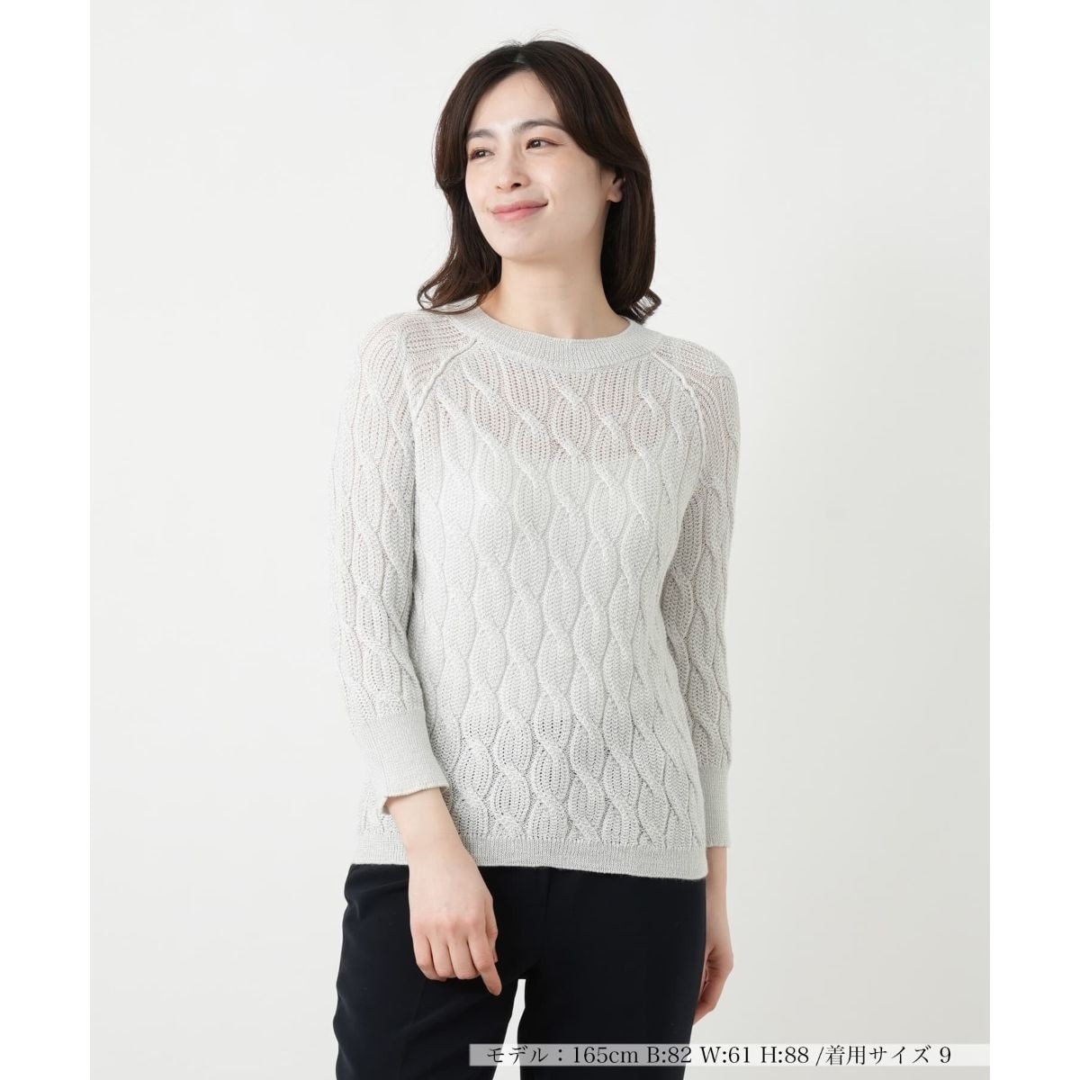 光を受けるたびに繊細なラメが煌めき、顔周りを明るく彩る「BARNA」のクルーネックニット。立体的なケーブル編みの模様が、コーディネートに豊かな表情と奥行きを演出。手首をすっきりと見せる絶妙な袖丈が、春らしい軽やかさと程よい抜け感を与えてくれます。肌馴染みの良い柔らかな質感は着心地も良く、一枚で着映えするのはもちろん、インナーとしても大人のエレガンスを品良く格上げしてくれるアイテムです。