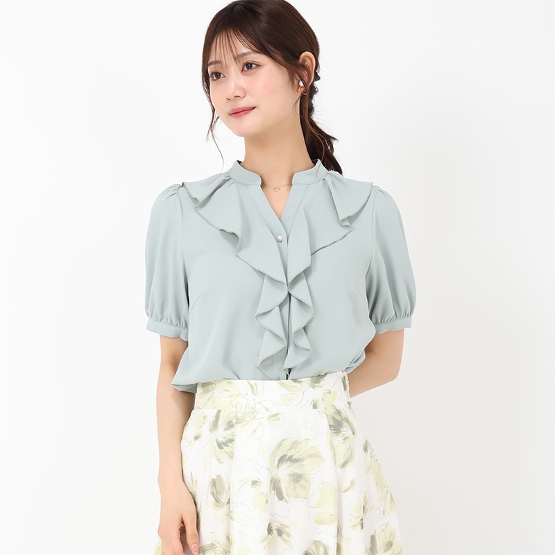 ひらりとしたラッフルフリルが動きを演出するブラウス。フロントにはパール調を施しており、煌びやかなアクセントになります。首元のスキッパーネックがポイント。スカートと合わせたフェミニンな着こなしがおすすめです。■fabric透け感[やや有り]裏地[無し]伸縮性[無し]生地の厚さ[薄手]