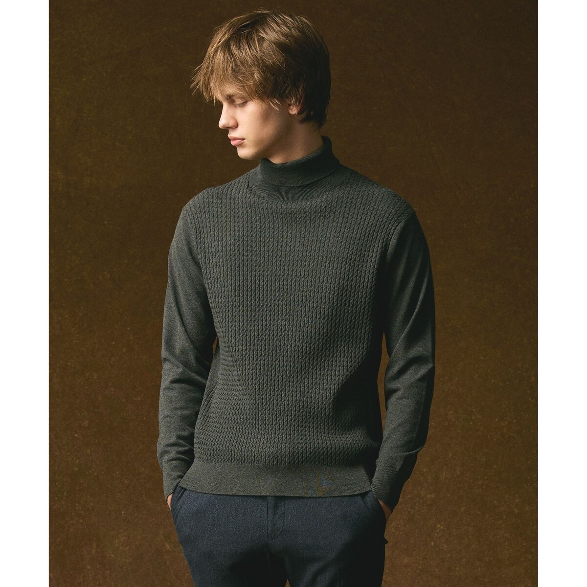 前身頃はの立体感あるミニケーブル編み、袖/後身頃はインナーとしてスッキリ着こなせるよう薄手の天竺編みで仕上げたタートルネックセーターです。