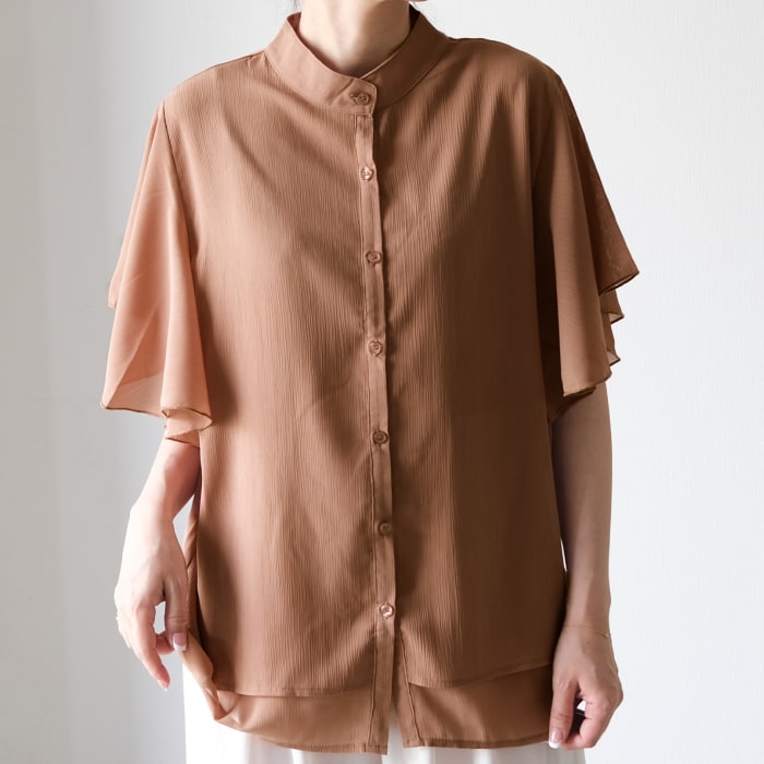 ふんわりとボリューム感のあるフリルが華やかなラッフルスリーブブラウス。 動くたびに袖のフリルが揺れ、ほんのり甘めの大人の抜け感を演出。バンドカラーで顔回りをスッキリ落ち着いた印象に。フェミニンから大人カジュアルまで幅広いコーデに活躍するアイテム。