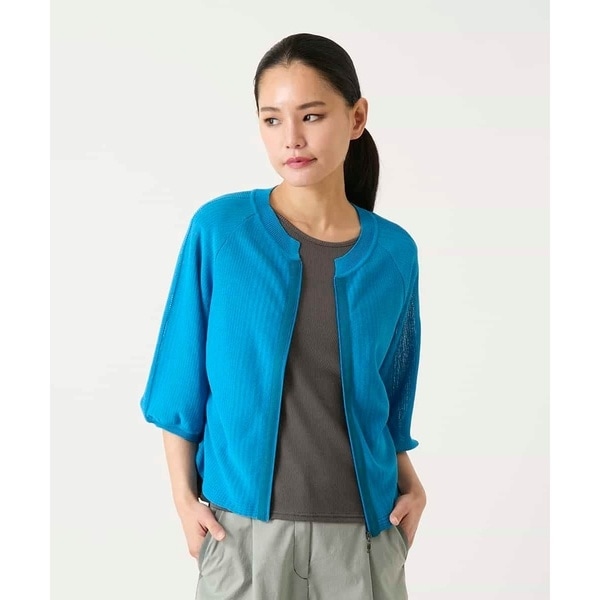 ナイロンやコットンを混合した軽やかな風合で清涼感のあるソフトな一着。コンパクトな丈感でどんなボトムとも相性が良く、ワンピースの羽織りとしても活躍します。ネックラインやサイドライン、バックポイントにリブアクセントを加えて立体感あるフォルムを演出。袖口を絞ってふっくらとさせたお袖やジップサイドのリボンもさり気ないポイントです。