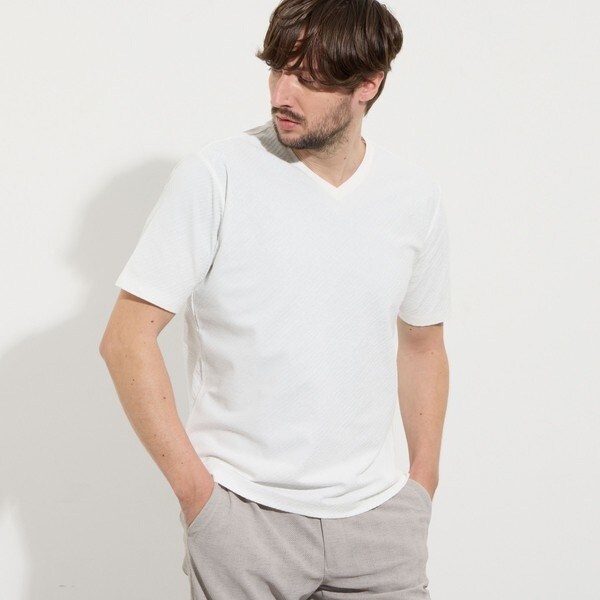 オリジナルバーク風リンクスジャカード生地をバイヤス仕様にした浅めのVネック半袖プルオーバーになります。