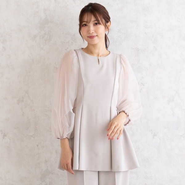 サイドから後ろウエストにかけて切替を入れて、腰回りにふんわりとボリュームを持たせたペプラムデザインとチュールを重ねたボリューム袖が可愛いデザイン。