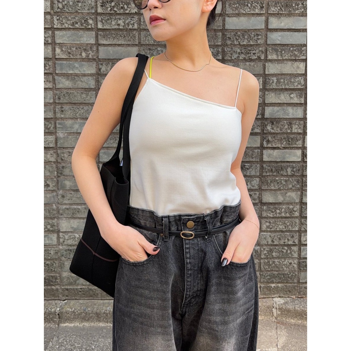 アシンメトリーなネックラインが目を引くデザインで、華奢なストラップとのバランスが洗練された印象に。