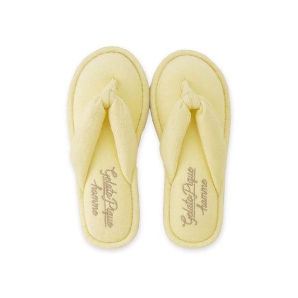 素足にはいても心地良い、柔らかなパイル素材を用いたビーチサンダル風のルームシューズです。ふっくらとした鼻緒とインソールが、1日がんばった足元を心地良くサポート。スタイリッシュな筆記体ロゴのワンポイント刺繍入りです。色は明るいイエローとピンク、涼しげなブルーとネイビーの4色展開。同時期に展開するパイルのルームウェアとコーディネートしたり、ギフトにもおすすめです。