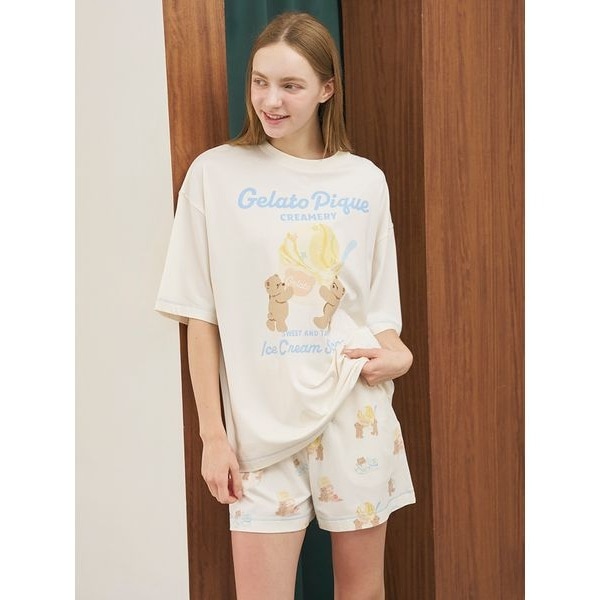 とろけるアイスクリームとベアをカラフル&ポップに描いた、ファミリーでお楽しみいただけるアイスクリームベアシリーズです。接触冷感加工を使用したプリントTシャツは、汗ばむ日にもするんと着用いただけるビッグシルエット。夏らしい色合いの大きなアイスクリームを運ぶベアを、ロゴと組み合わせてキャッチーに描きました。袖や裾に入れた配色ステッチでアクセントを効かせ、可愛い印象に仕上げています。色はクリームとピンクの2色展開。同シリーズのショートパンツと合わせたり、同時期に展開するスムーズィーライトのグラデーションボーダーパンツとの組み合わせもおすすめです。HOMME、KIDS、BABYアイテムとリンク・コーディネートもお楽しみください。