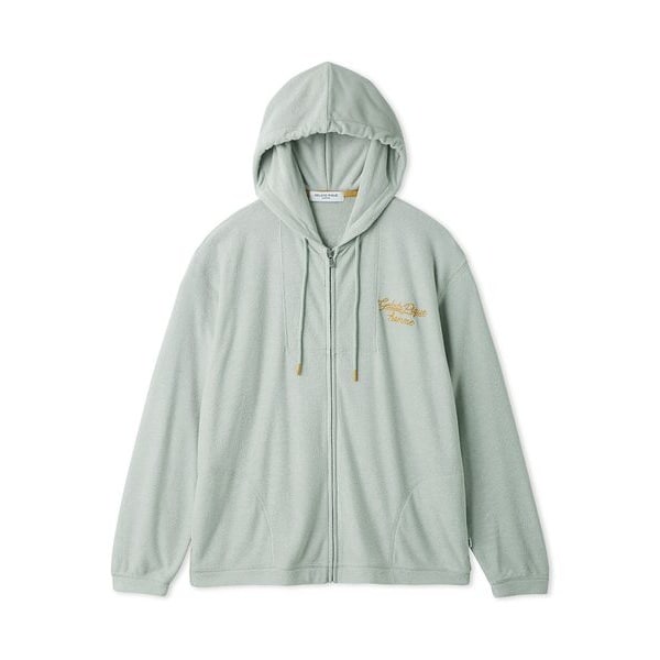 肌に涼しい接触冷感と、UVカット機能を備えた夏らしいパイル素材のシリーズです。冷房対策などに気軽に羽織っていただるジップパーカ。胸元に入れた筆記体ロゴと紐先のアグレット、ネックラインの内側にあしらった配色デザインをさりげなくリンクさせた、ミニマルなデザインがポイントです。リラックスしたシーンにも似合う1枚。色はベージュ、ミント、ネイビーとONLINE限定カラーのダークグレーをご用意しました。同シリーズのハーフパンツやハットと組み合わせてお楽しみいただけます。