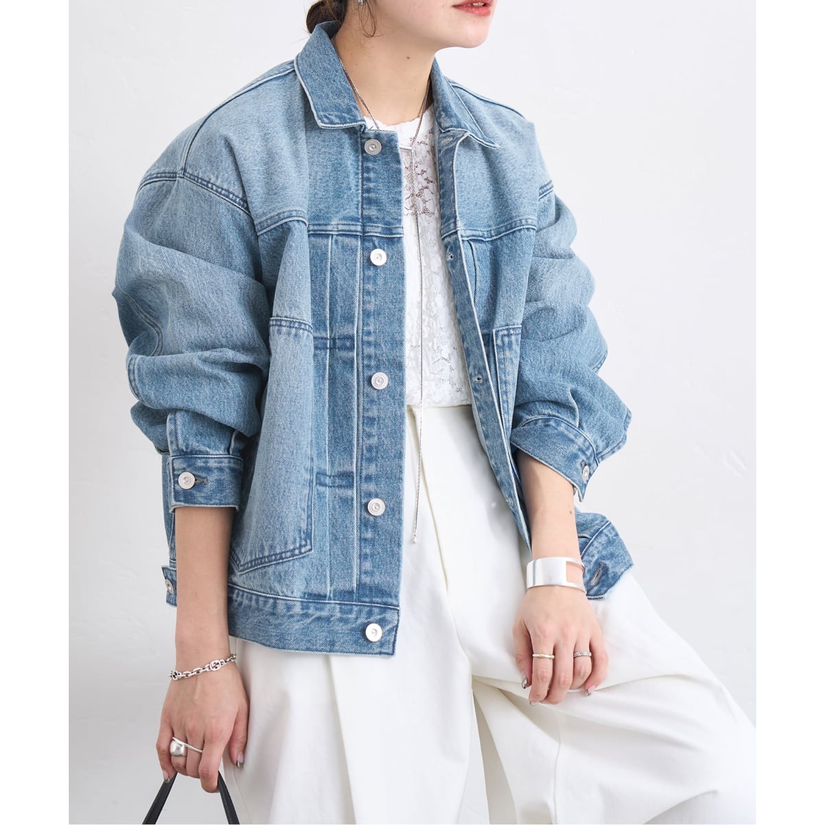ゆとりのあるサイズ感で、ヒップが隠れるくらいの着丈なので、合わせるボトムを選びません。