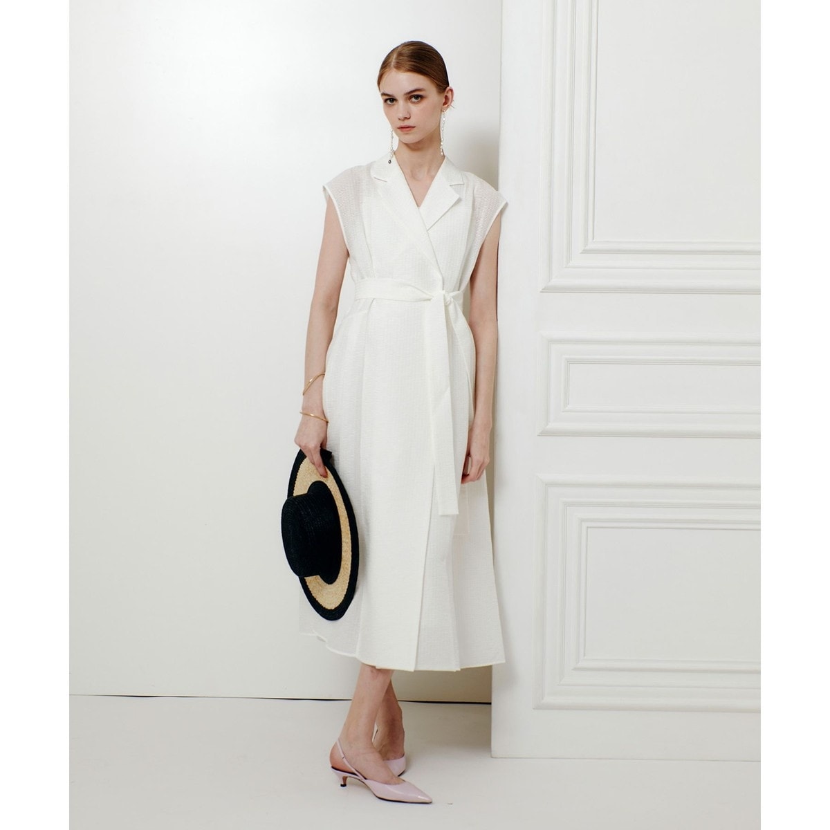 共布のリボンでウエストマークすることで、メリハリのある美しいシルエットを演出します。