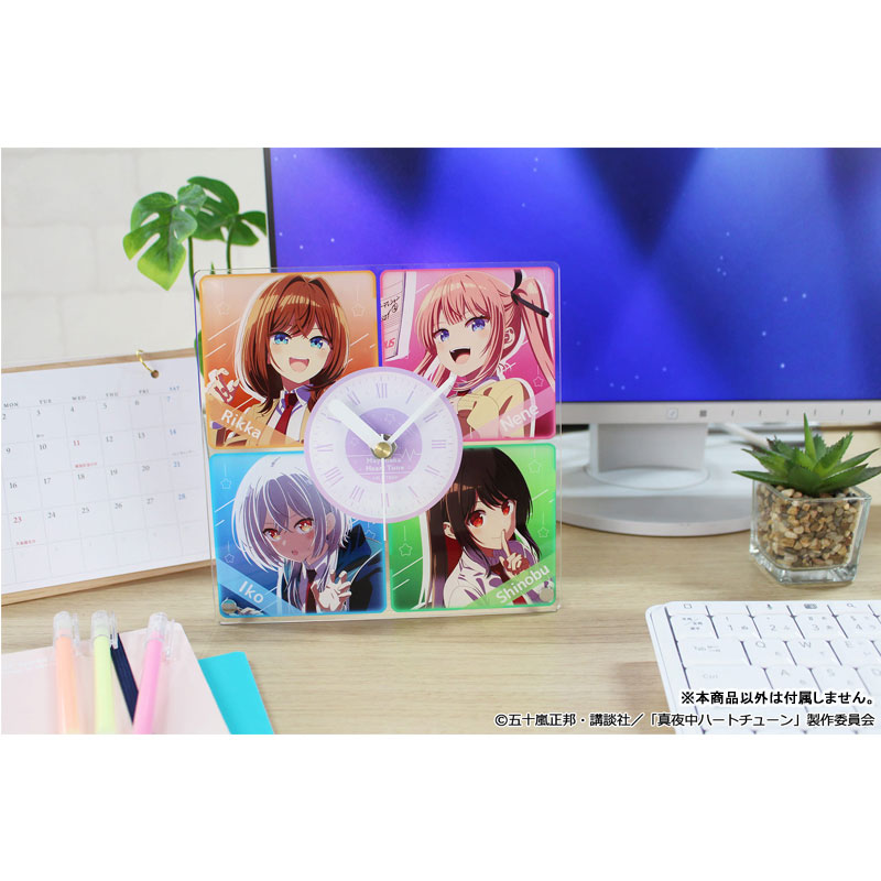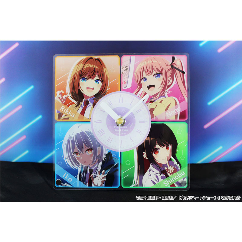 TVアニメ『真夜中ハートチューン』より、アクリル置時計が登場します! 井ノ華六花/日芽川寧々/霧乃イコ/雨月しのぶのイラストを使用しました。 しっかりとした3mm厚のアクリル素材を使用しており、190mm×190mmと存在感のある大きさです。