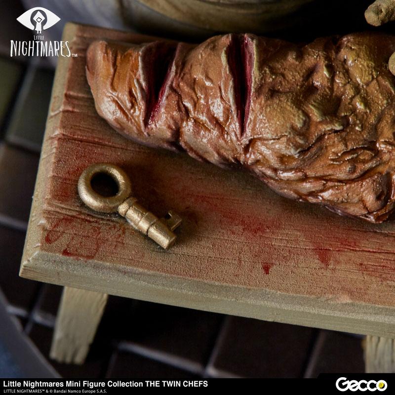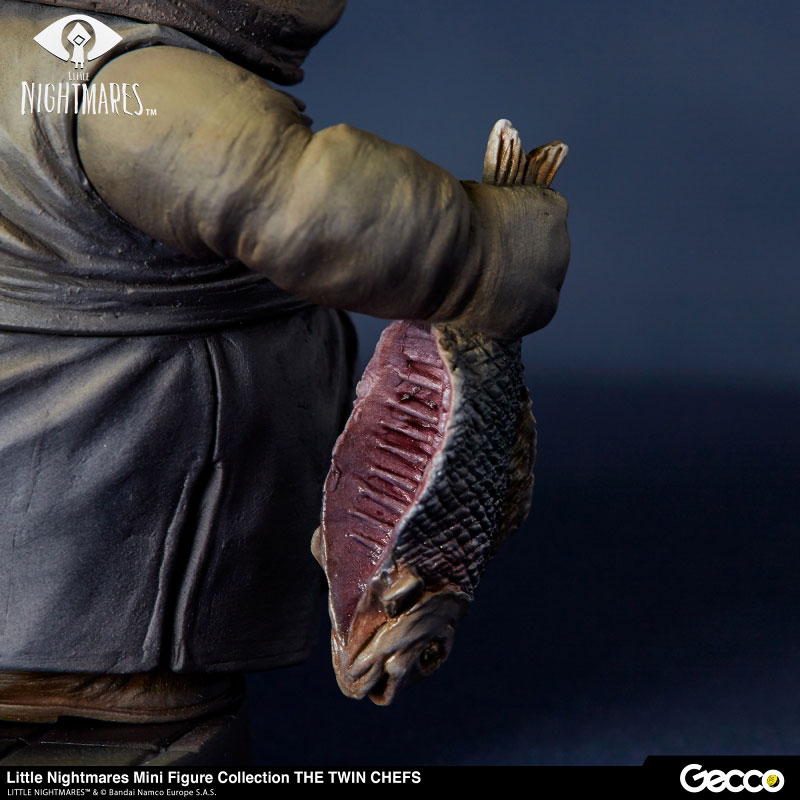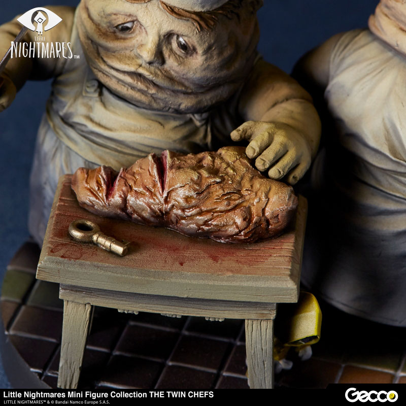 モウの船内で肉を刻み、ごちそうを用意する双子のシェフ。調理台に置かれた肉や、手に持つ魚、包丁など細部までしっかりと造り込むことで、ゲーム内の台所の雰囲気を切り取った様なアイテムに仕上げています。双子のシェフの持つキャラクターの不気味さを際立てるグロテスクとも言える、はち切れんばかりの贅肉とたるんだ皮膚を顔から指先に至るまで、ゲーム内の雰囲気そのままに見事に再現。