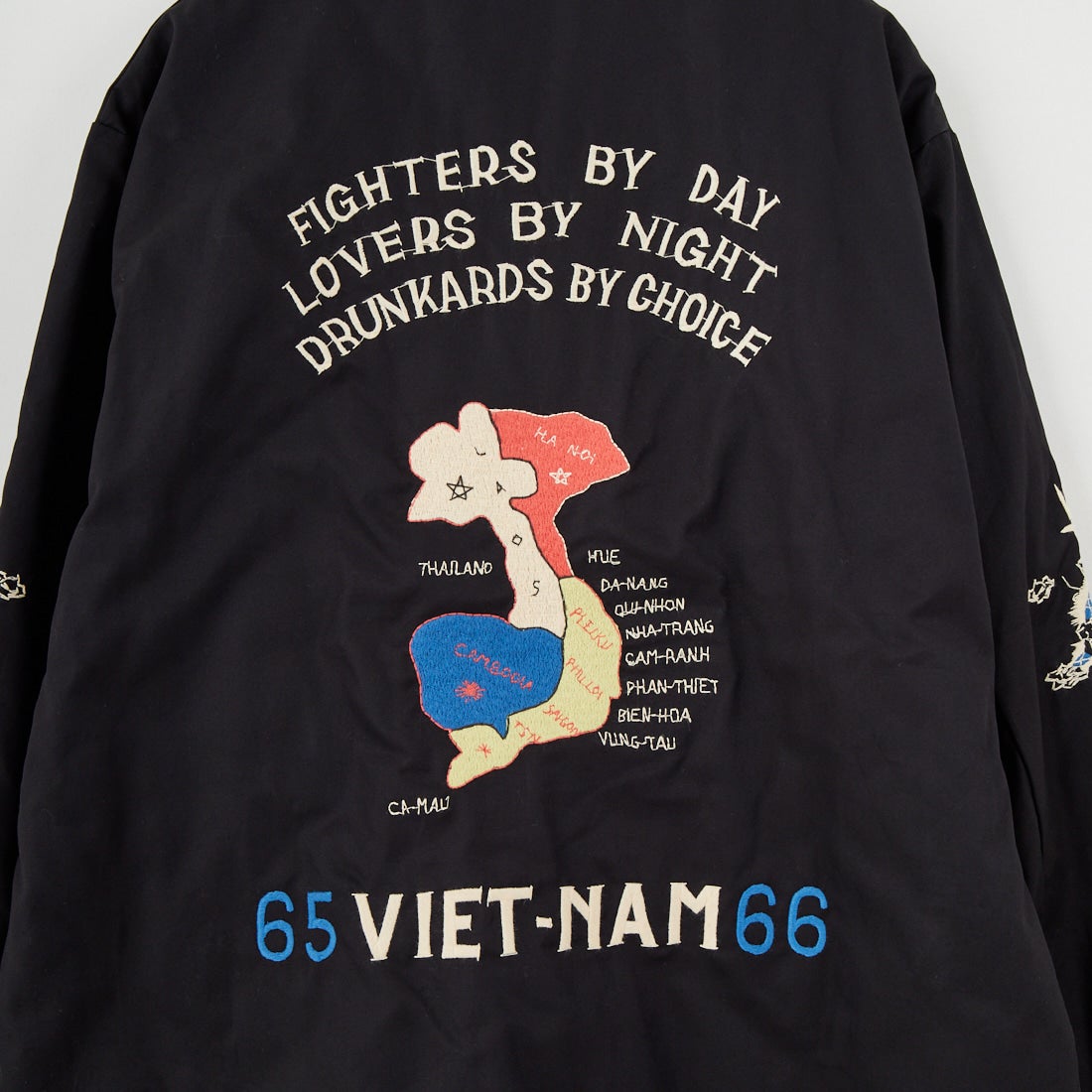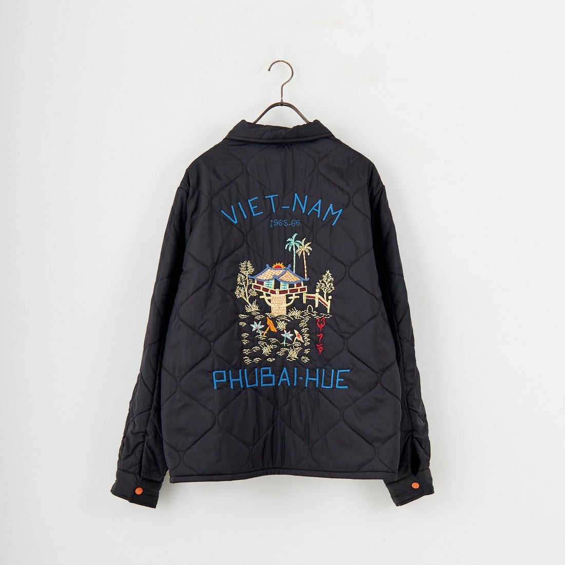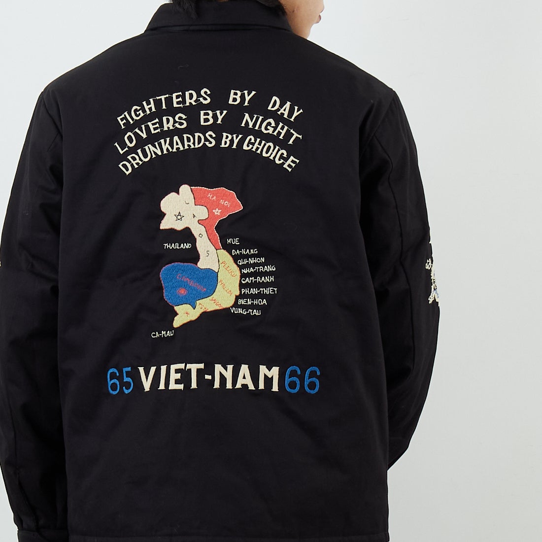 1960年代中期、ベトナム中部フエ省フバイに駐留していた米兵がカスタムオーダーで仕立てたリバーシブル仕様のベトジャンを再現。コットンツイル面には、胸の虎と「福」の文字、袖の龍、背面のベトナムマップなど、象徴的なモチーフを大胆に刺繍。リバーシブル面はナイロンリップストップ生地を採用し、胸に星条旗と南ベトナム軍のフラッグ、背には風景画を描いた珍しいデザインを落とし込みました。ブラックには同色ライナー、グリーンにはタイガーストライプ柄を使用。どちらの面でも異なる表情が楽しめる一着です。戦後のスカジャン文化を継承しつつ、ミリタリーとクラフト感を融合させたこのベトジャンは、シンプルなデニムスタイルからカーゴパンツまで相性抜群。時代を超えて愛されるヴィンテージライクな魅力を放ちます。