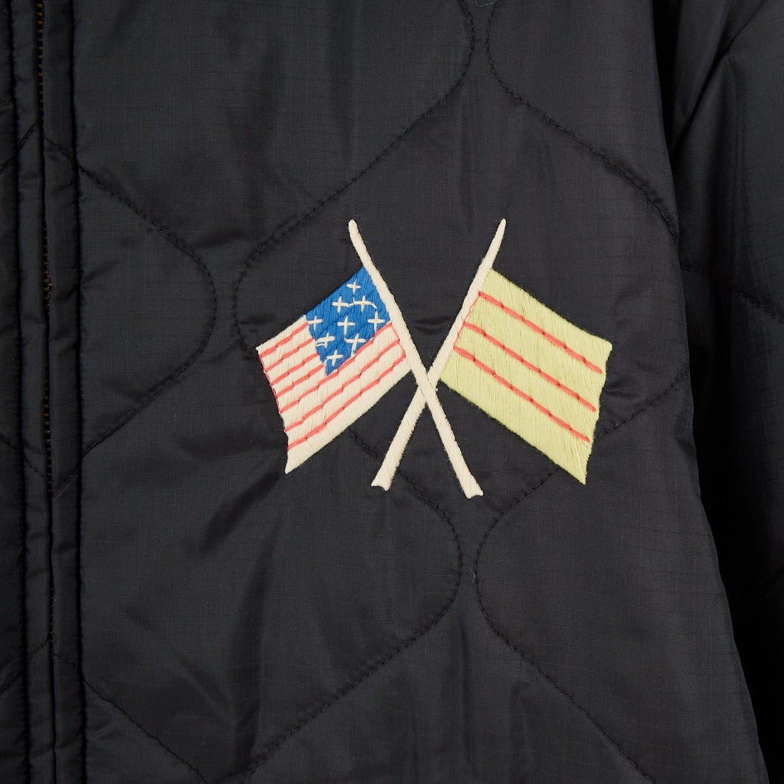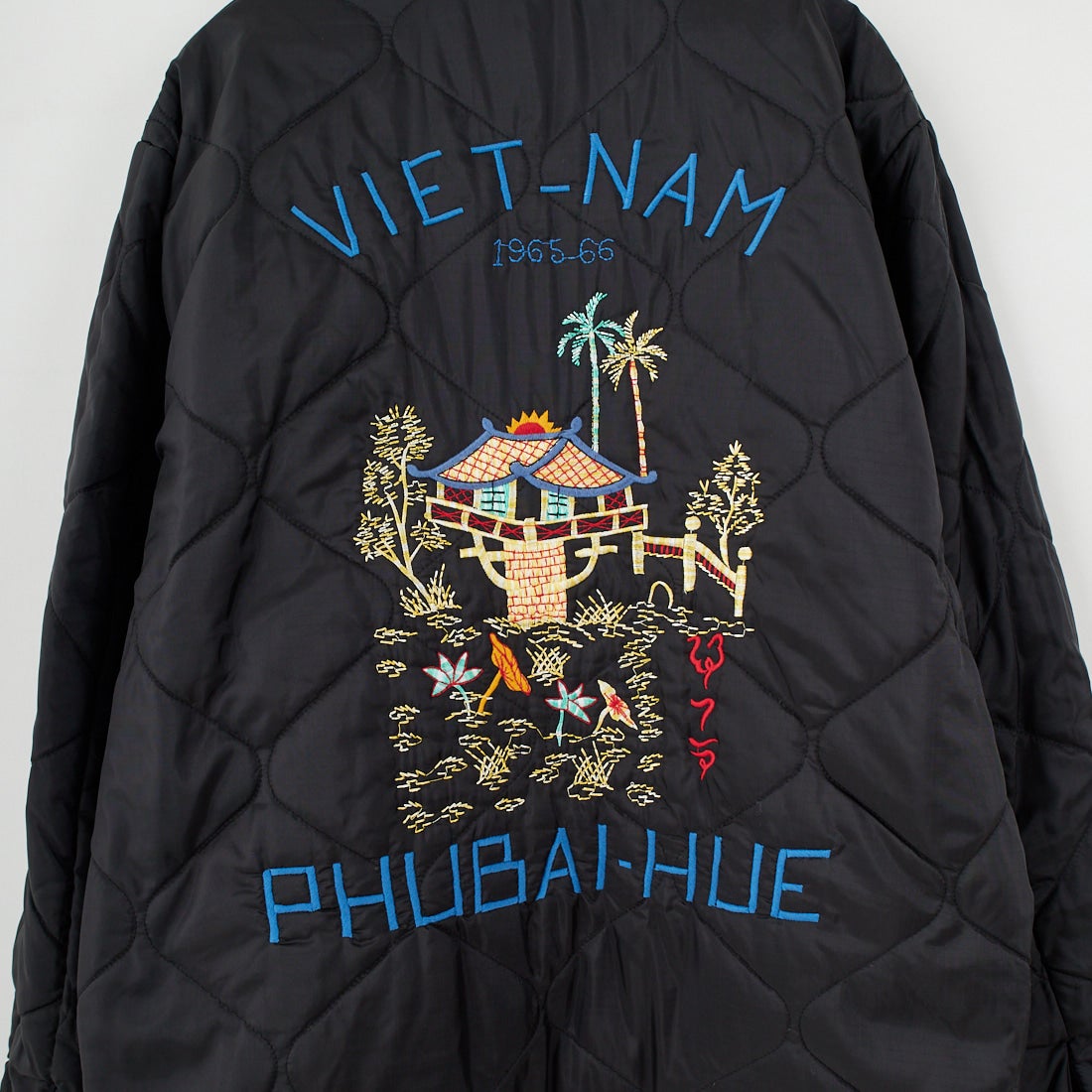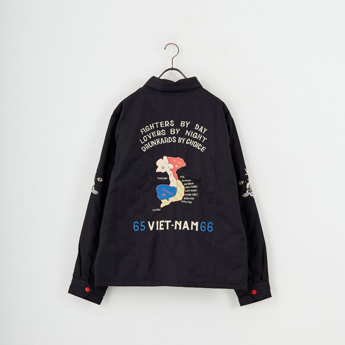 1960年代中期、ベトナム中部フエ省フバイに駐留していた米兵がカスタムオーダーで仕立てたリバーシブル仕様のベトジャンを再現。コットンツイル面には、胸の虎と「福」の文字、袖の龍、背面のベトナムマップなど、象徴的なモチーフを大胆に刺繍。リバーシブル面はナイロンリップストップ生地を採用し、胸に星条旗と南ベトナム軍のフラッグ、背には風景画を描いた珍しいデザインを落とし込みました。ブラックには同色ライナー、グリーンにはタイガーストライプ柄を使用。どちらの面でも異なる表情が楽しめる一着です。戦後のスカジャン文化を継承しつつ、ミリタリーとクラフト感を融合させたこのベトジャンは、シンプルなデニムスタイルからカーゴパンツまで相性抜群。時代を超えて愛されるヴィンテージライクな魅力を放ちます。