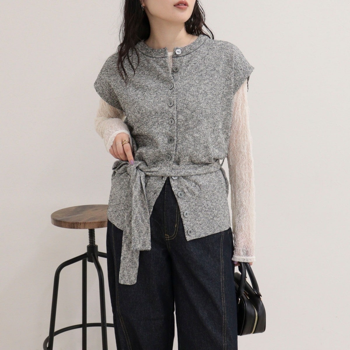 ●棚番号AU-1 BEAMS HEART ビームスハート ニット ロング ワンピース ベスト グレー 灰 杢 サイドスリット リボン ベルト付 ノースリーブ