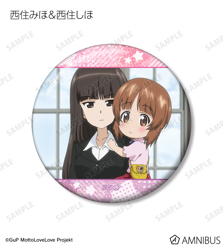西住みほ、武部沙織、五十鈴華、秋山優花里、冷泉麻子、島田愛里寿のイラスト(10年前ver.)、西住みほ、西住まほ、島田愛里寿、西住しほ、島田千代の印象的なシーンをホログラム加工を施した缶バッジに仕上げました。