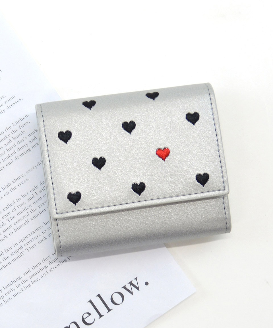 1つだけ色が違うハートがポイントの三つ折り財布。