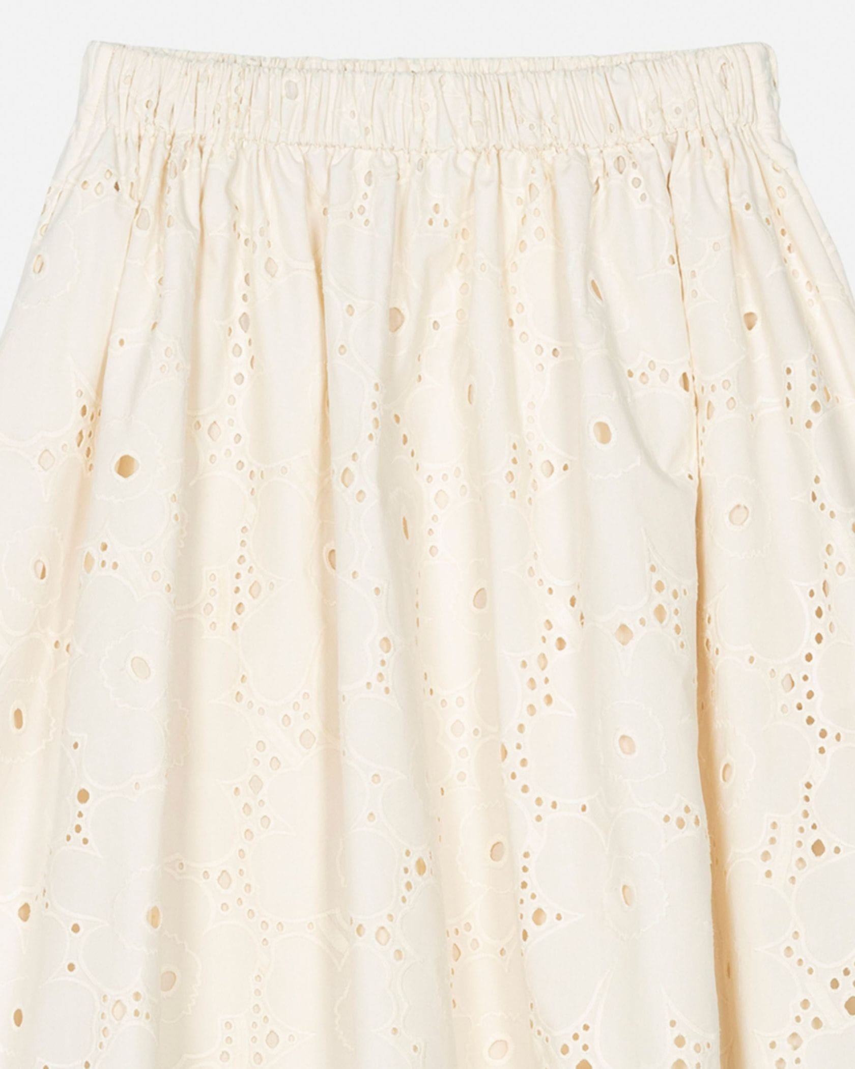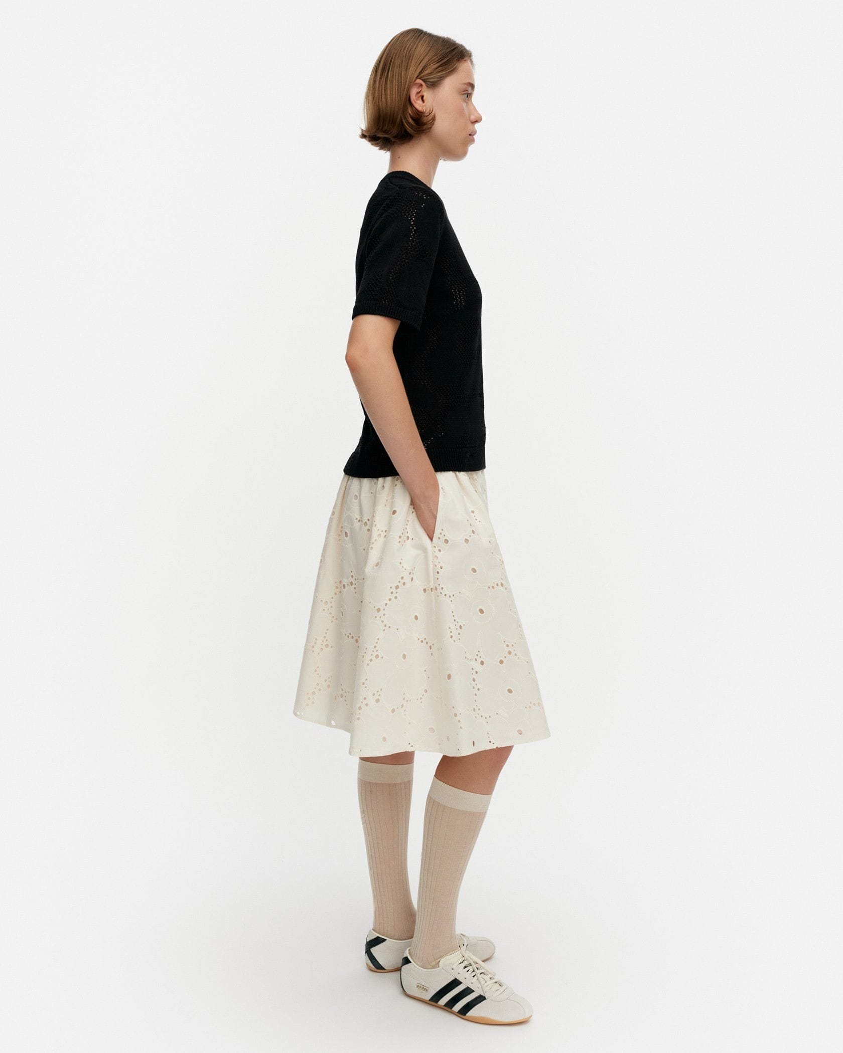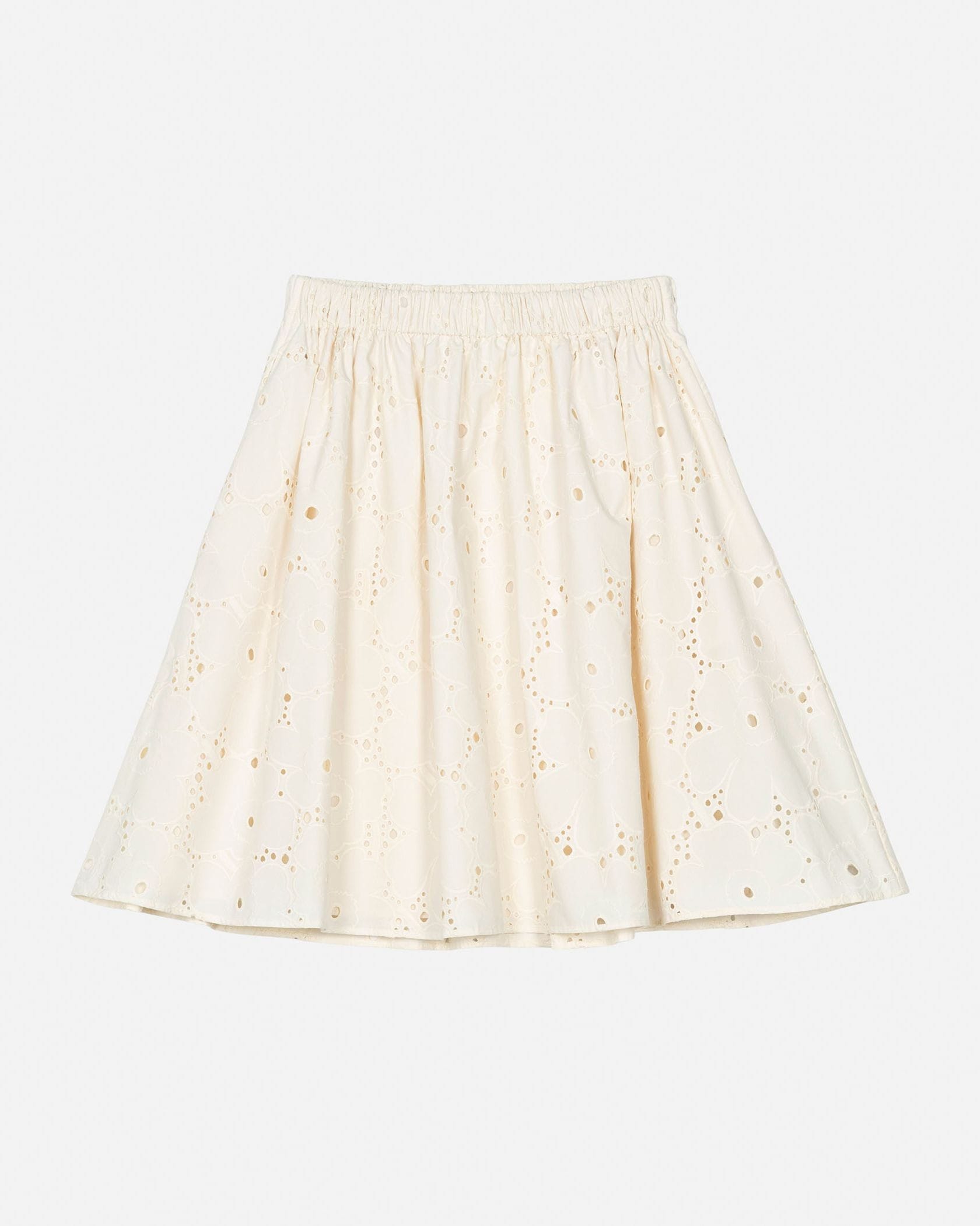Unikko柄のカットワークレースがエレガントなデザインのスカート。フラワーモチーフの周りのアイレットの透かしが軽やかなムードで春夏シーズンにぴったり。便利なサイドポケット付き。ウエストはゴム仕様で履き心地快適なのもうれしいポイント。フェミニンなお出かけスタイルが実現します。