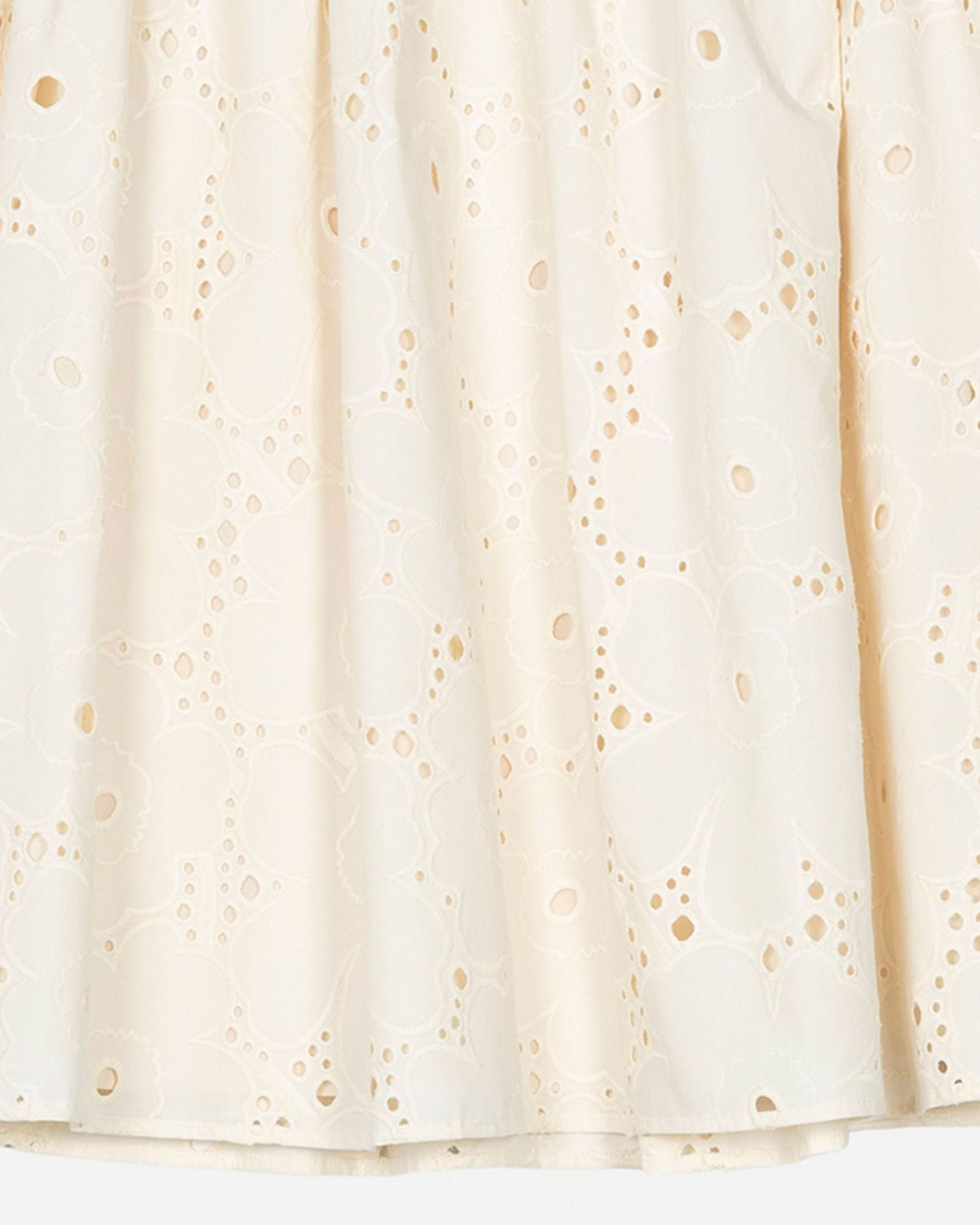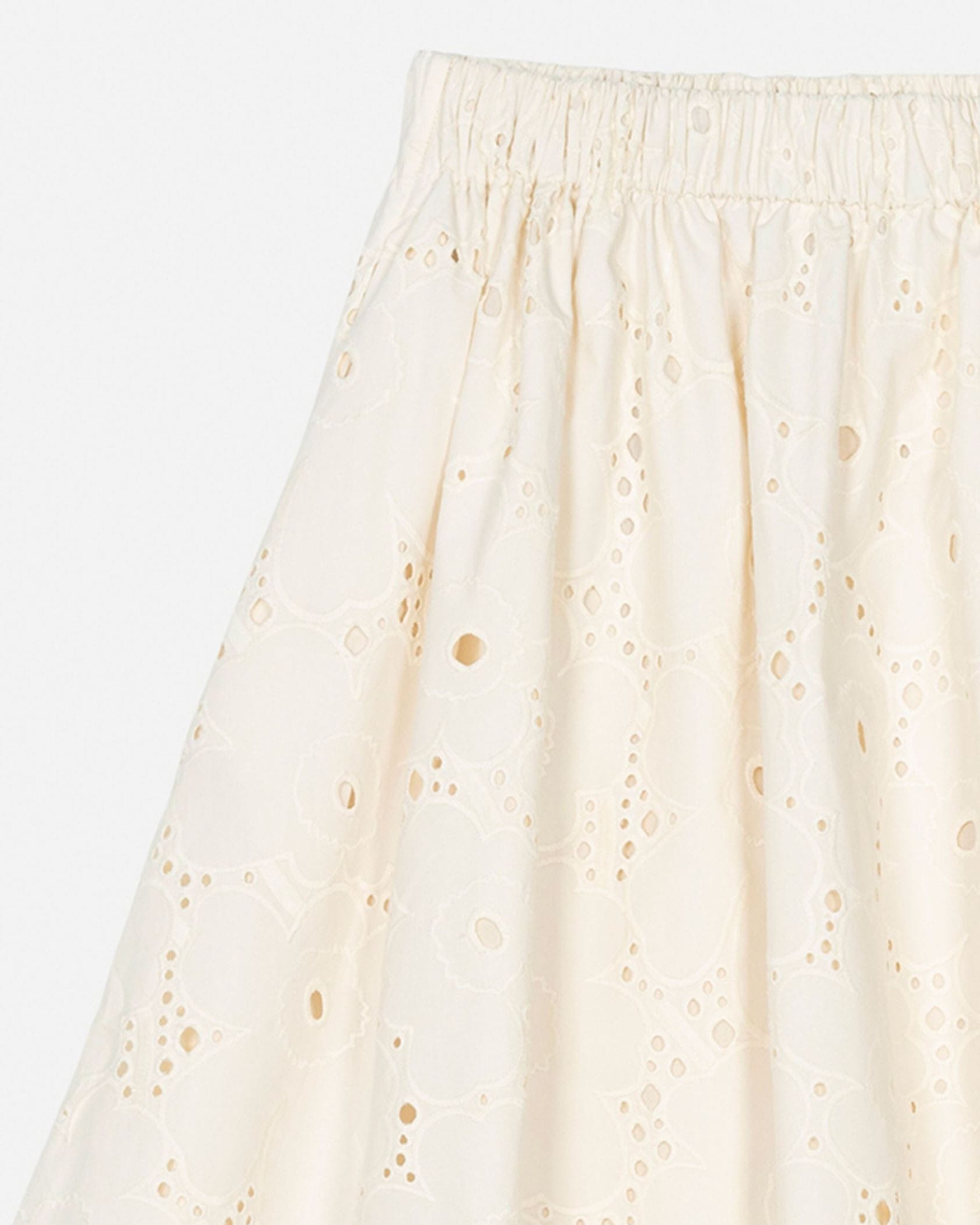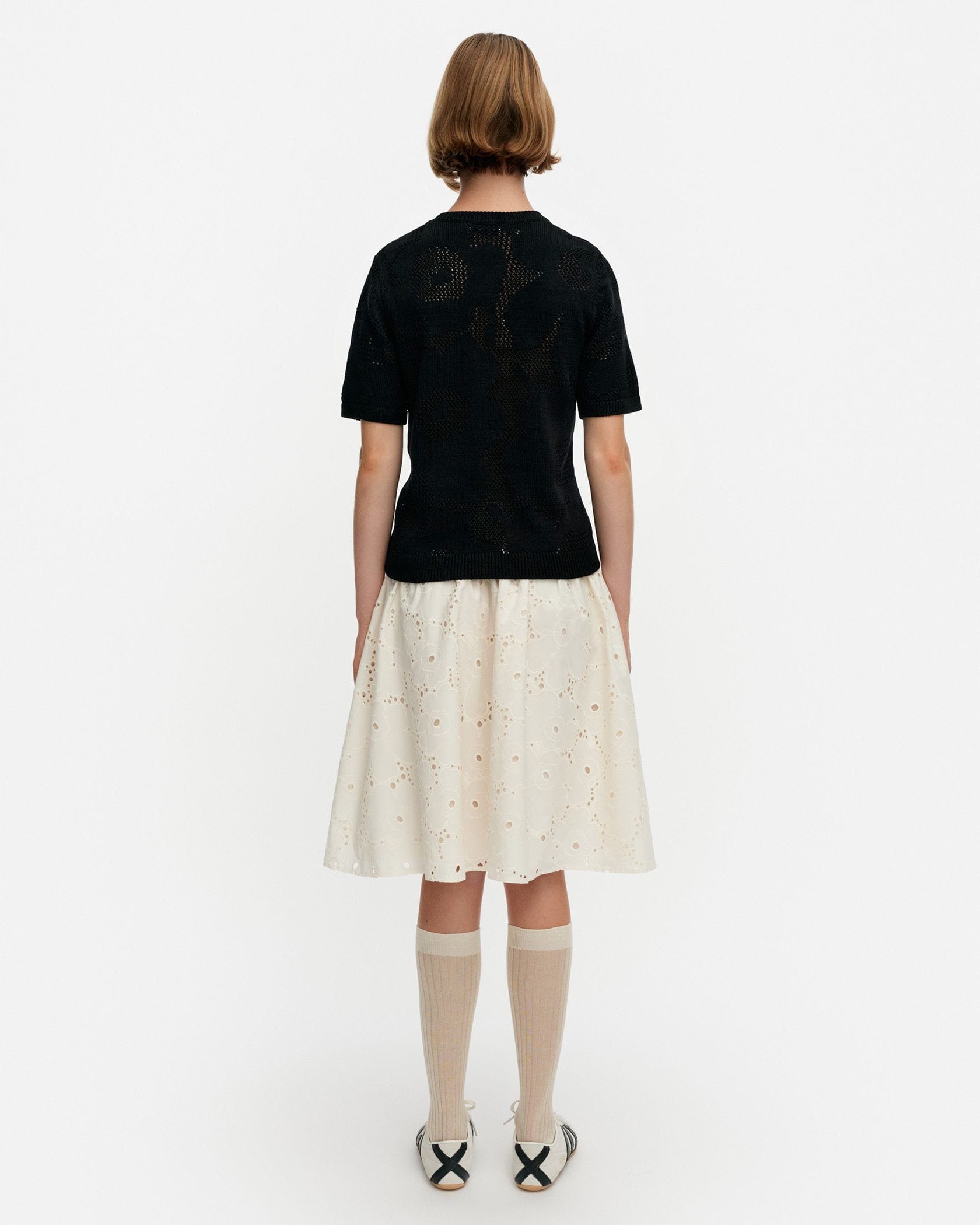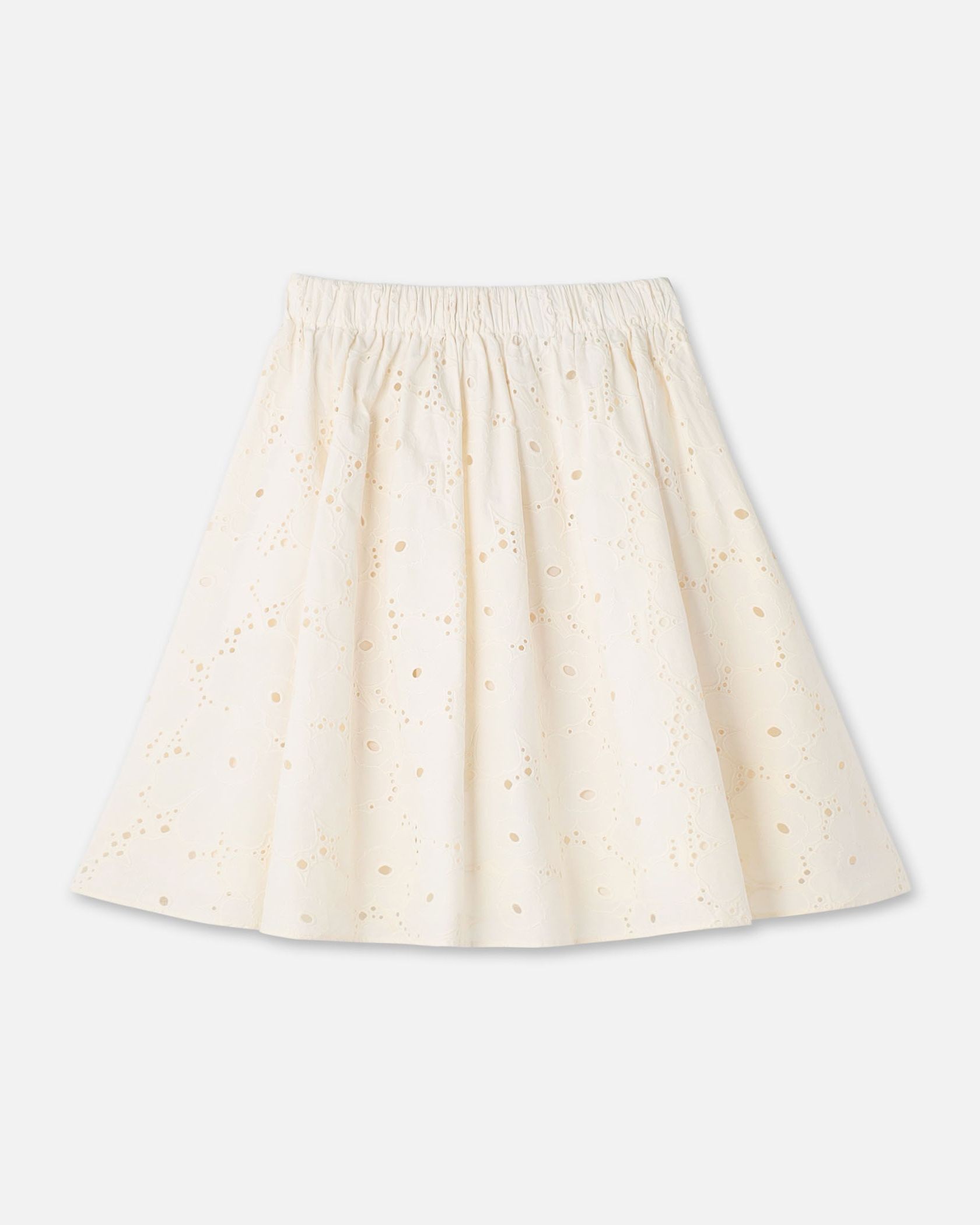 Unikko柄のカットワークレースがエレガントなデザインのスカート。フラワーモチーフの周りのアイレットの透かしが軽やかなムードで春夏シーズンにぴったり。便利なサイドポケット付き。ウエストはゴム仕様で履き心地快適なのもうれしいポイント。フェミニンなお出かけスタイルが実現します。