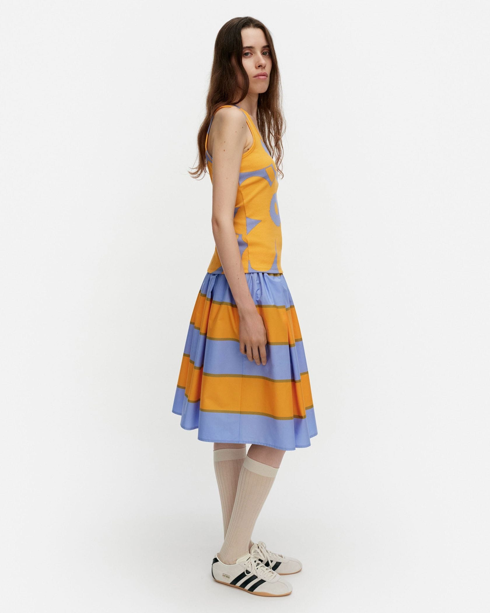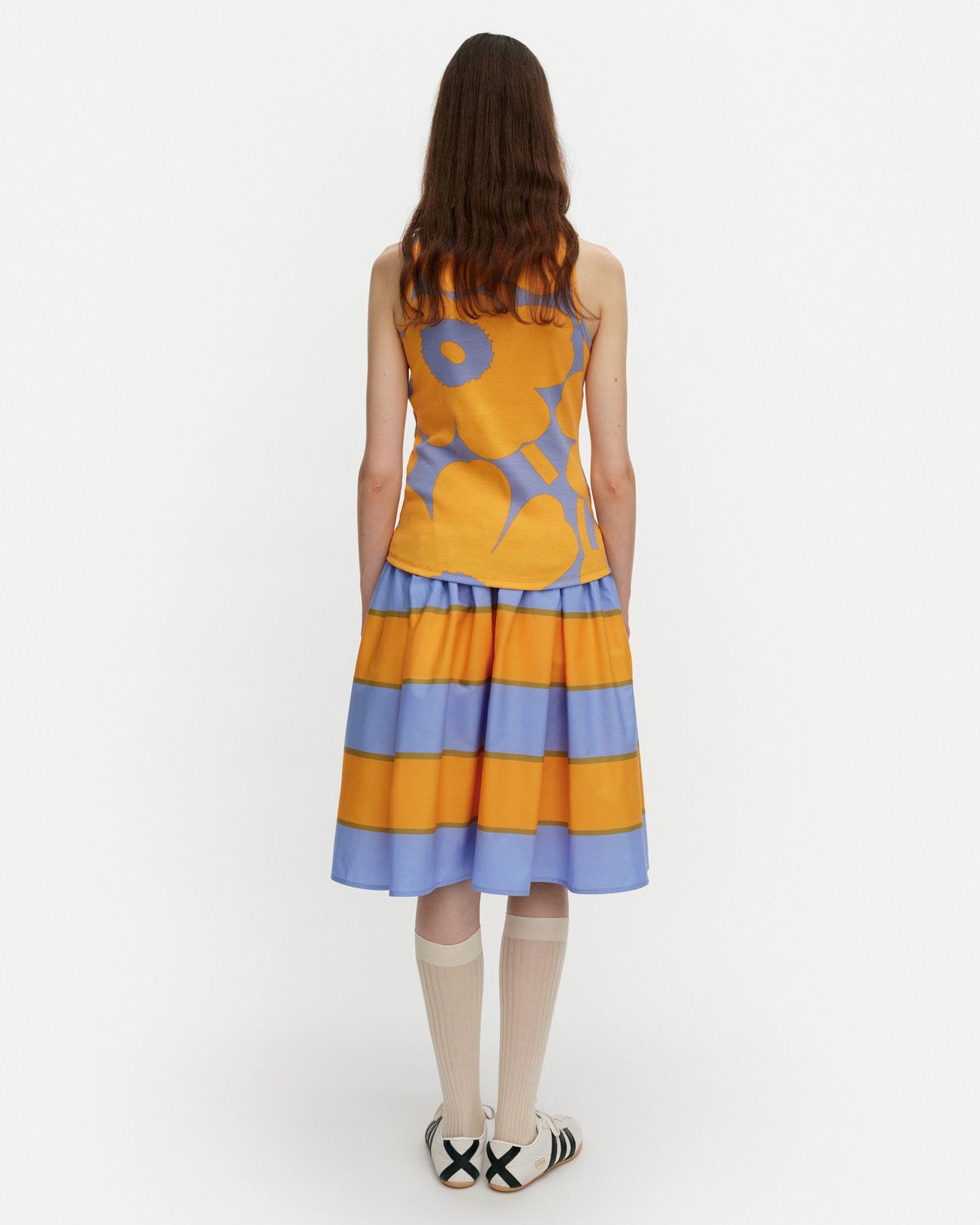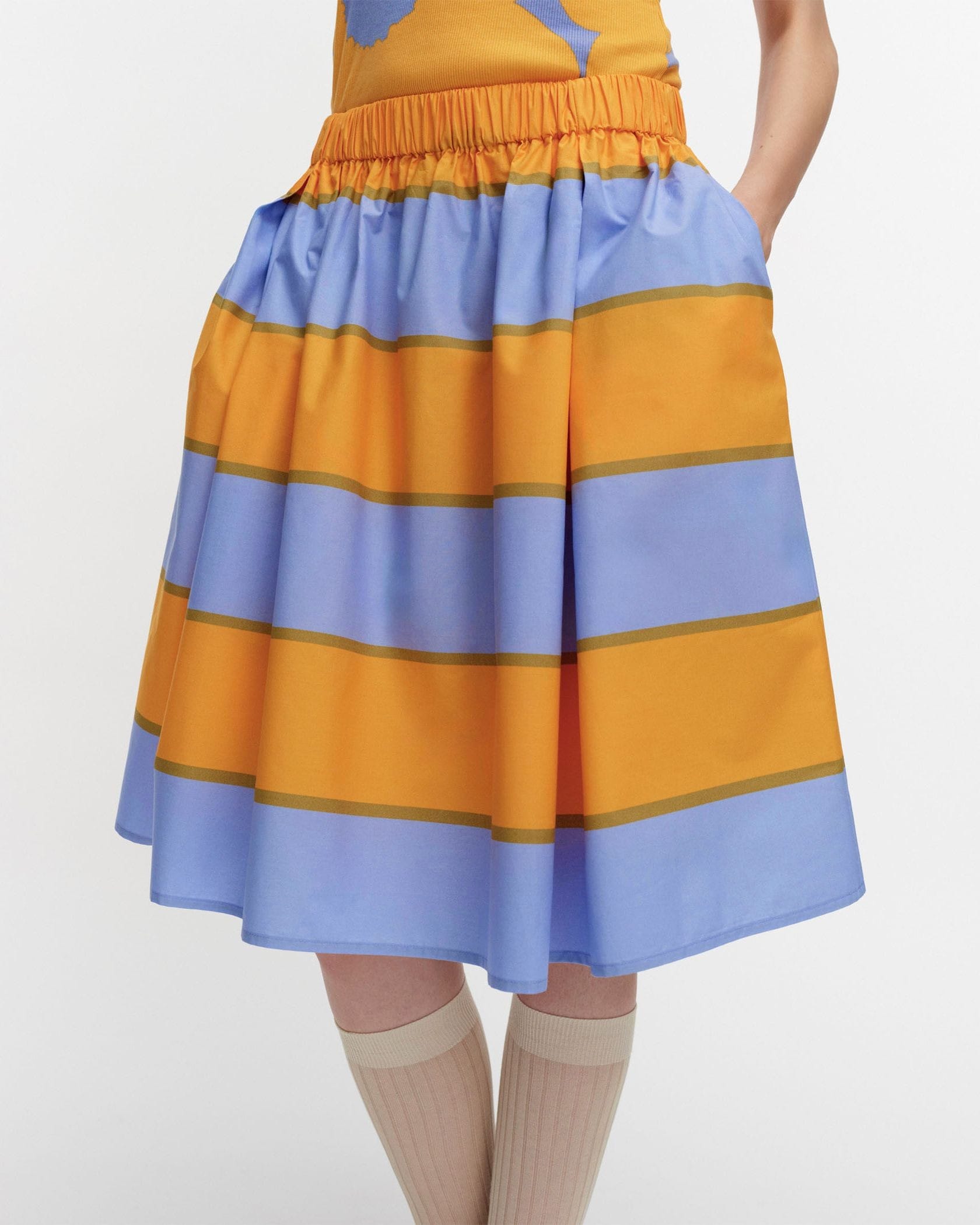 Vuokko Eskolin-Nurmesniemiがデザインを手がけた、「ギャラリー」を意味するGalleria(ガレリア)柄のスカート。コントラストの強いバイカラーが印象的な1着です。ウエストがゴム仕様で、コンフォートな着用感を提供。爽やかなコットン素材で、春夏シーズンの装いにぴったりです。