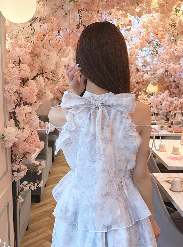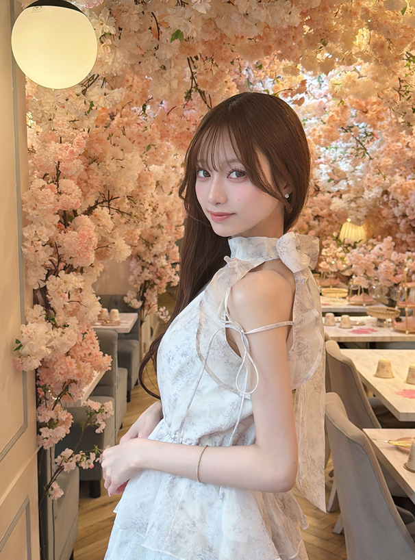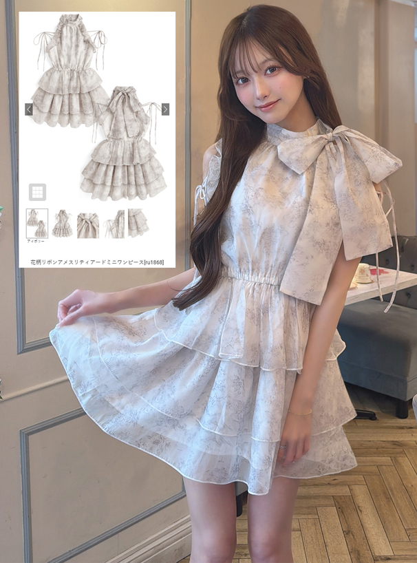 肩やバックネックにあしらったリボンもフェミニンな印象を与えるアクセント。