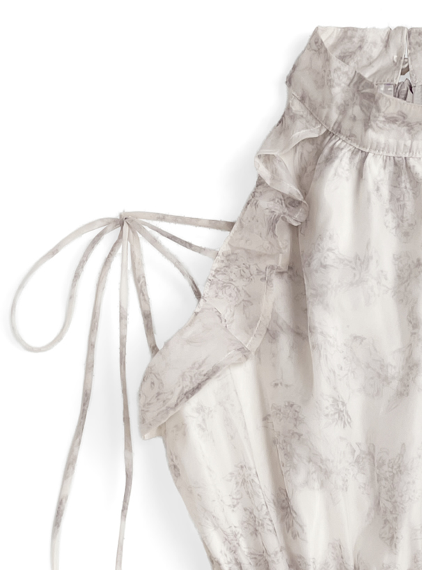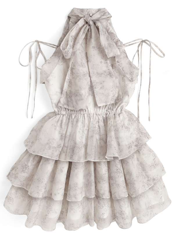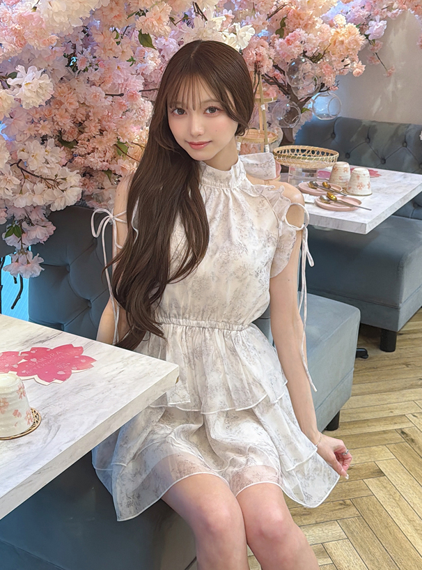 ハリのあるオーガンジー素材にニュアンスフラワーをのせたミニワンピース。