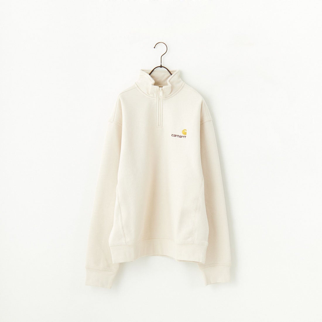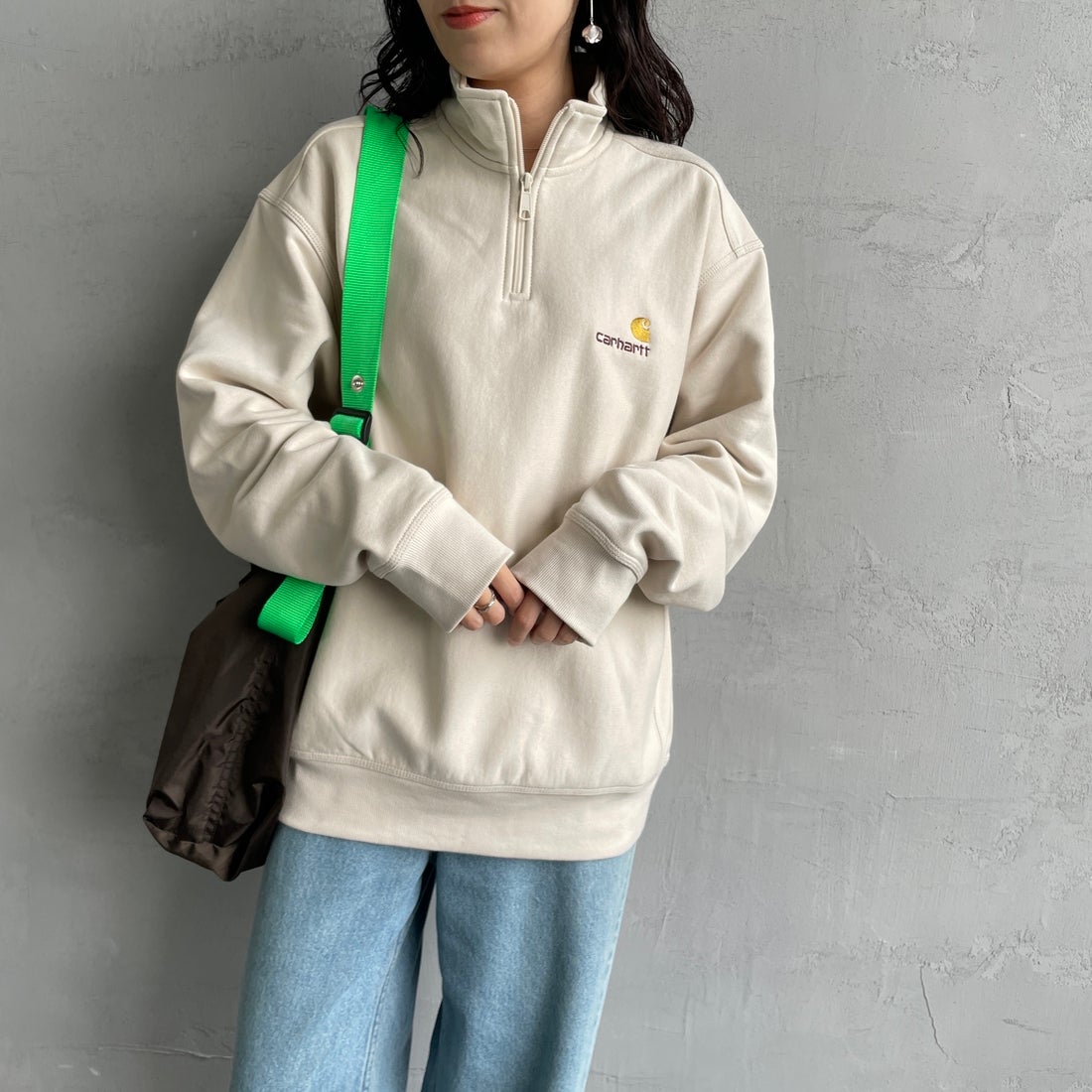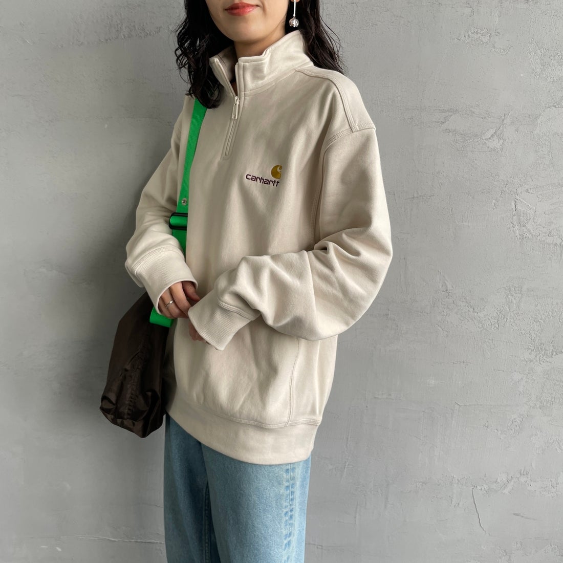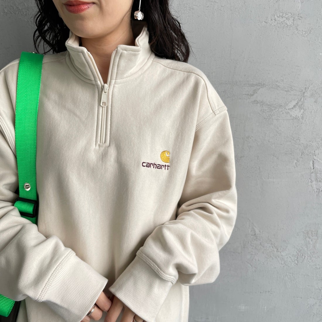 carhartt WIP[カーハートダブリューアイピー]のハーフジップアメリカンスクリプトスウェットシャツ。12.4ozの厚手の生地を使用した、定番のアメリカンスクリプトシリーズのハイネックハーフジップバージョンです。程よい高さのスタンドカラーで、インナーとの重ね着も楽しめます。シルエットはふっくらとしたルーズフィット。厚手の生地感、ルーズなシルエットによりクラシックな雰囲気を持つ一着です。