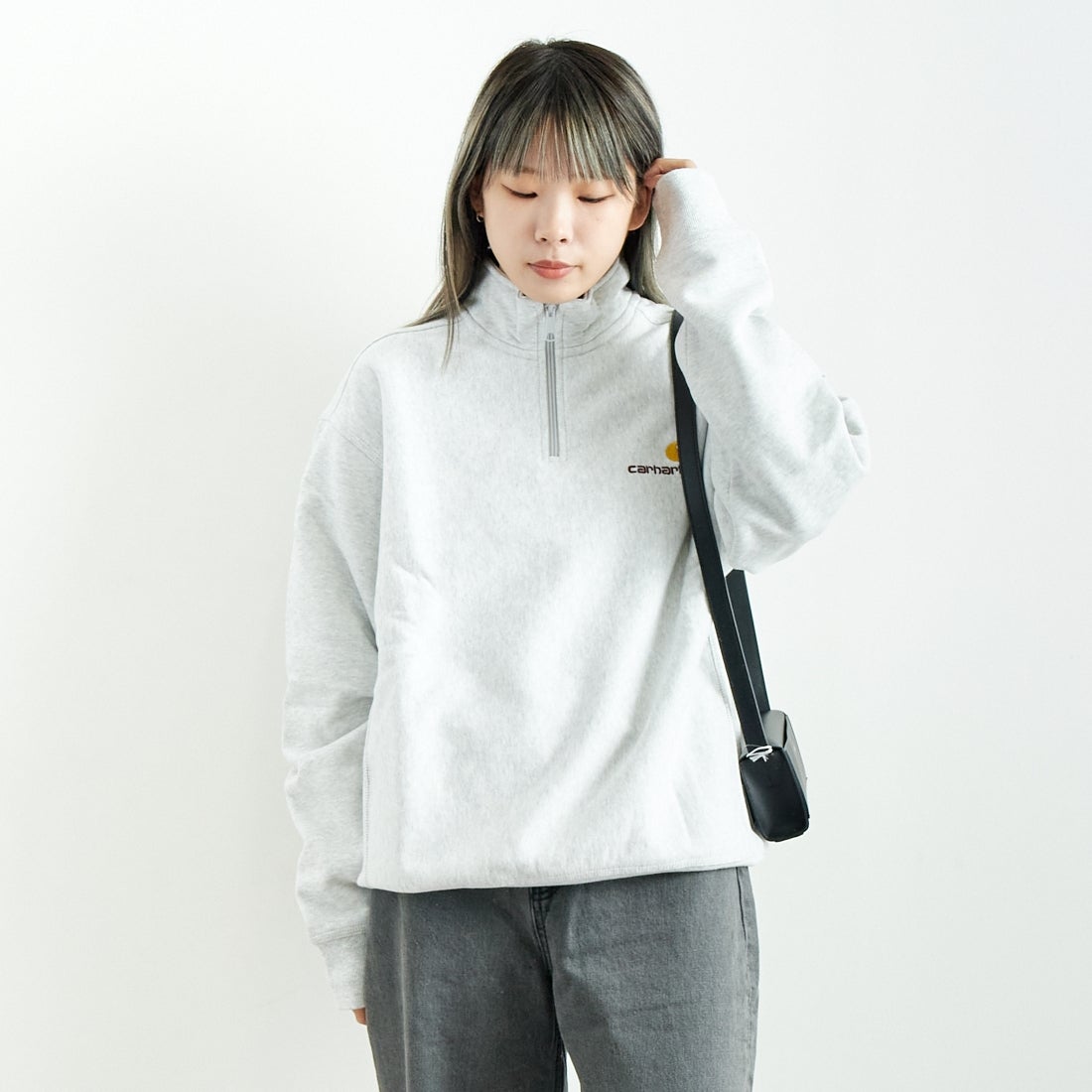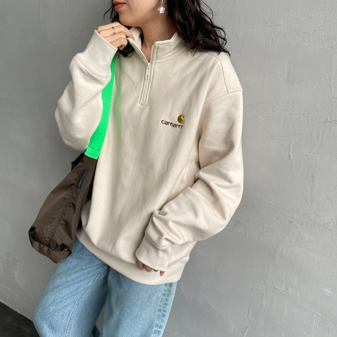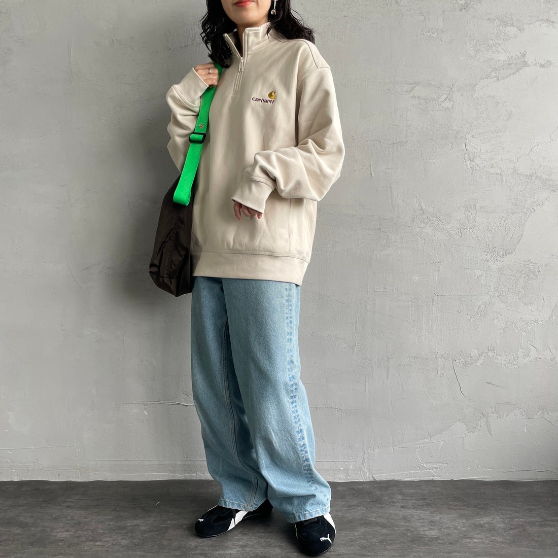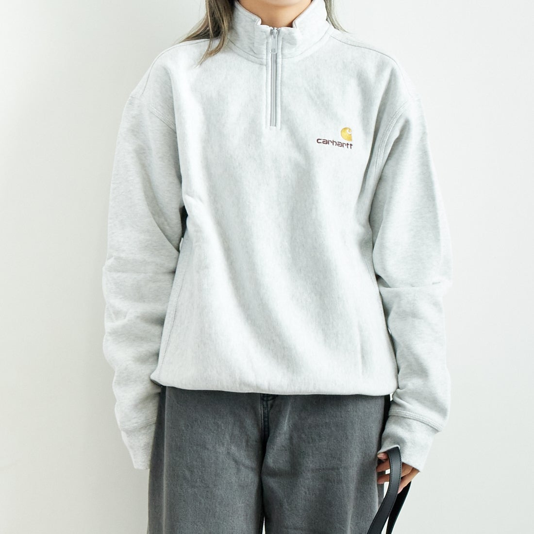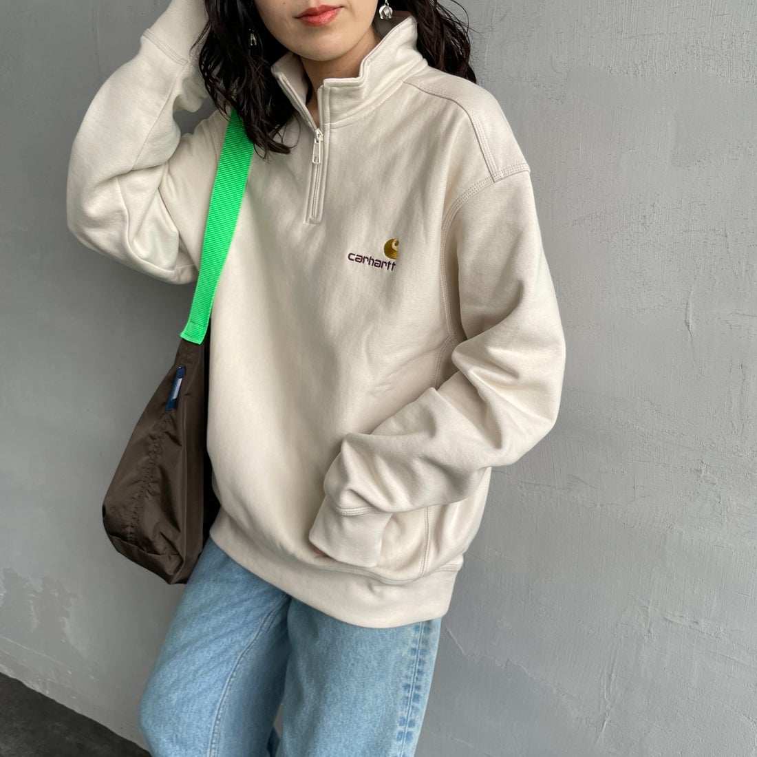 carhartt WIP[カーハートダブリューアイピー]のハーフジップアメリカンスクリプトスウェットシャツ。12.4ozの厚手の生地を使用した、定番のアメリカンスクリプトシリーズのハイネックハーフジップバージョンです。程よい高さのスタンドカラーで、インナーとの重ね着も楽しめます。シルエットはふっくらとしたルーズフィット。厚手の生地感、ルーズなシルエットによりクラシックな雰囲気を持つ一着です。