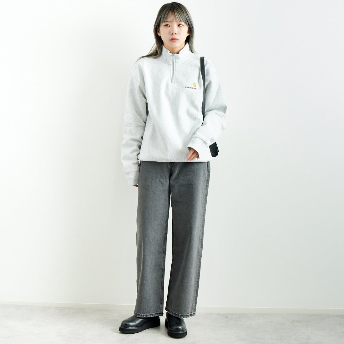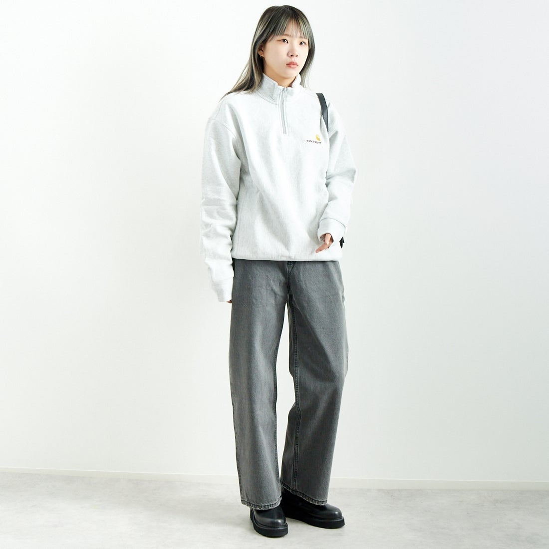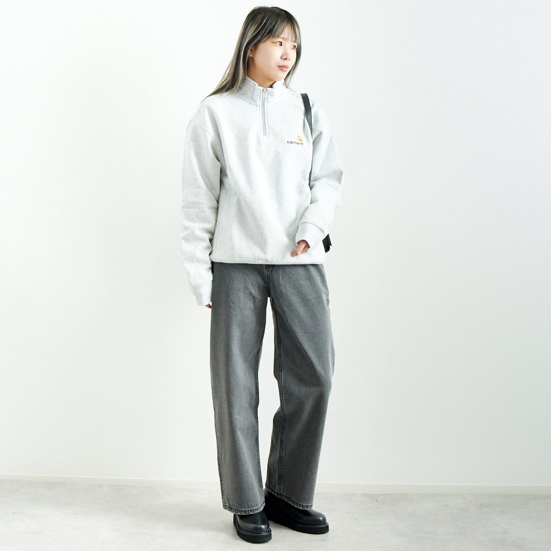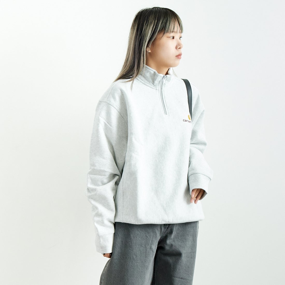 carhartt WIP[カーハートダブリューアイピー]のハーフジップアメリカンスクリプトスウェットシャツ。12.4ozの厚手の生地を使用した、定番のアメリカンスクリプトシリーズのハイネックハーフジップバージョンです。程よい高さのスタンドカラーで、インナーとの重ね着も楽しめます。シルエットはふっくらとしたルーズフィット。厚手の生地感、ルーズなシルエットによりクラシックな雰囲気を持つ一着です。