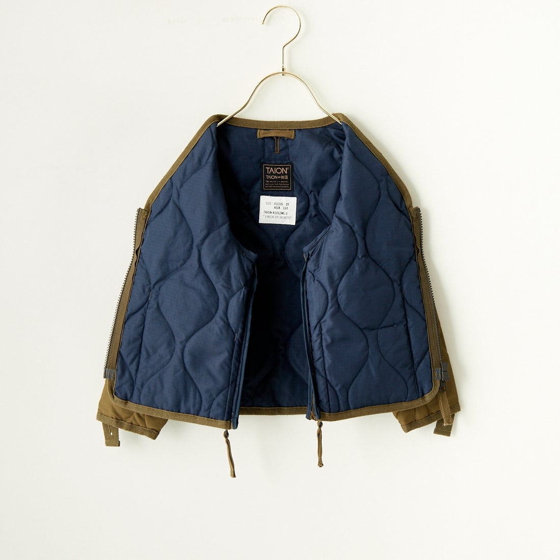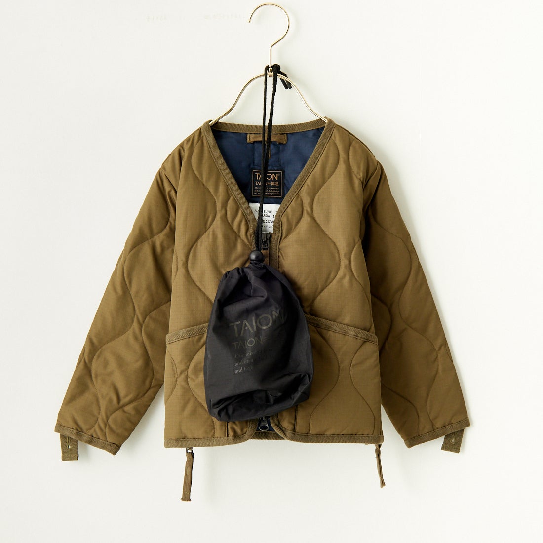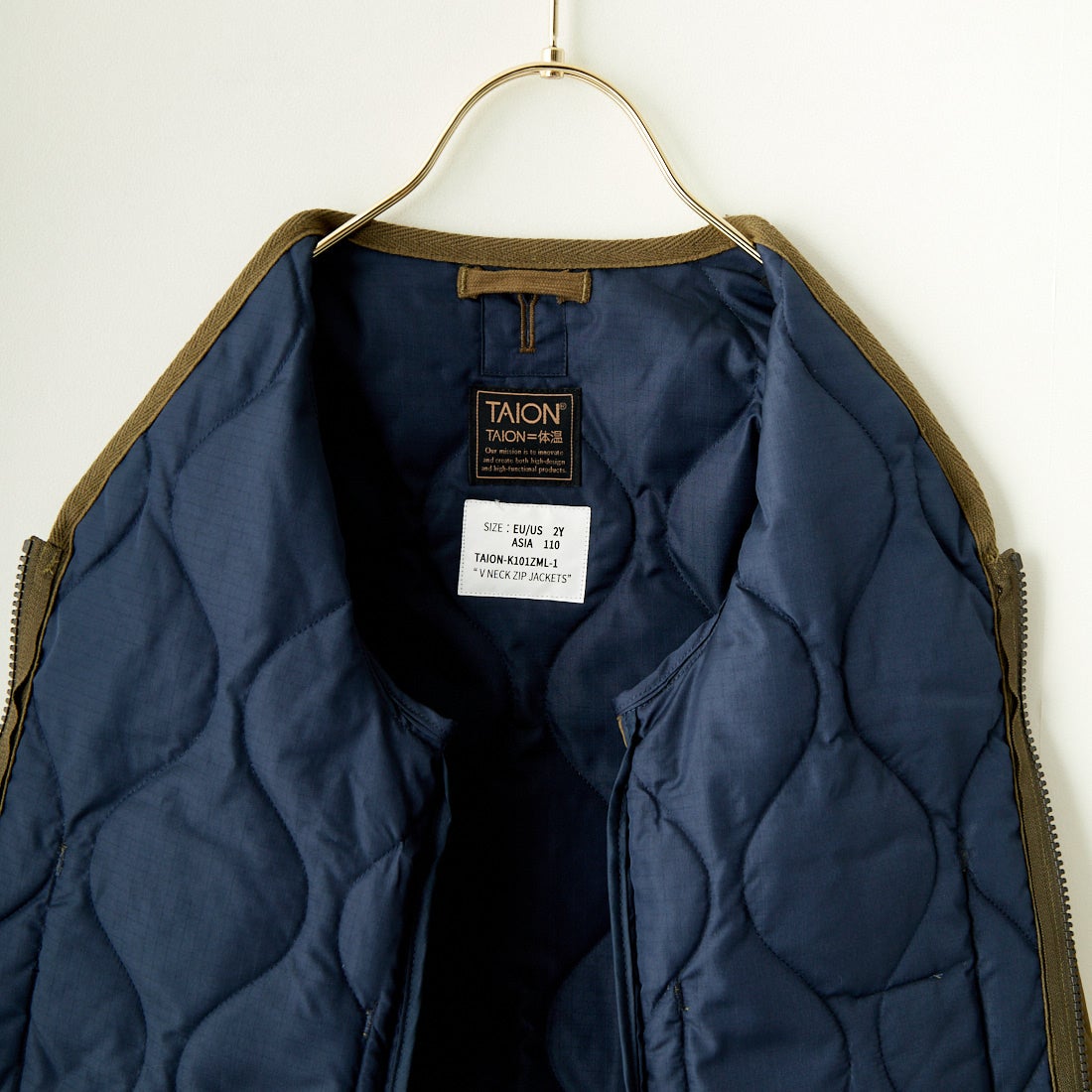 TAION[タイオン]のキッズミリタリー Vネックジップダウンジャケット。ミリタリーをモチーフにしたインナーダウンを取り揃えたMILITARY LINEから、キッズサイスのジップダウンジャケットが登場。ダウンカーディガンのような感覚で気軽に羽織れる着回しやすいデザインが特徴です。前たてダブルジップはスリットとしてコーディネートのアクセントに最適です。両脇スリットファスナーは可動域が増えることで動きやすくなり、ボトムのポケットにアクセスしやすく、重ね着もお楽しみいただけます。コンパクトに収納ができるパッカブル仕様で、外出時や旅行時にも重宝するアイテムです。