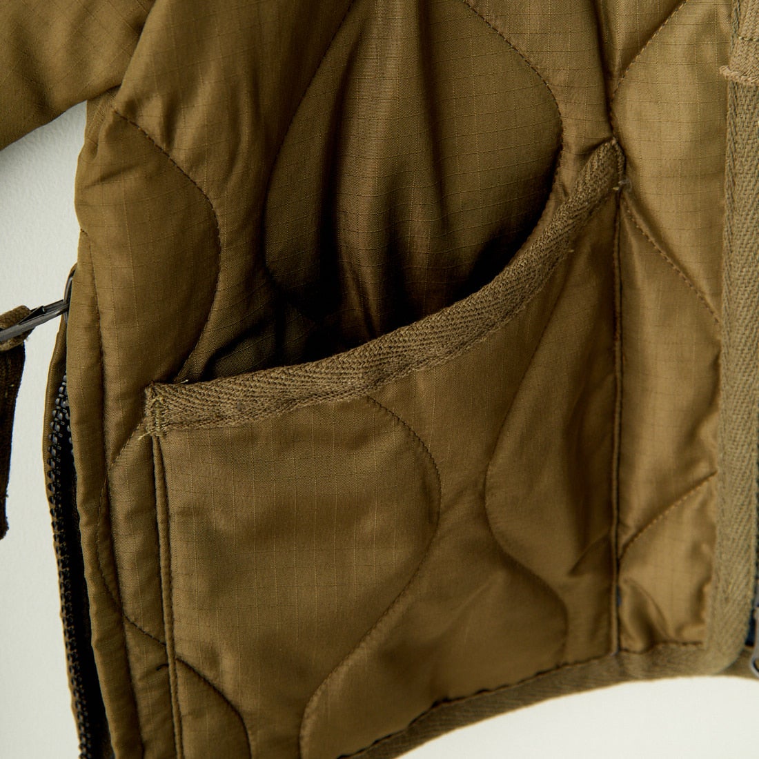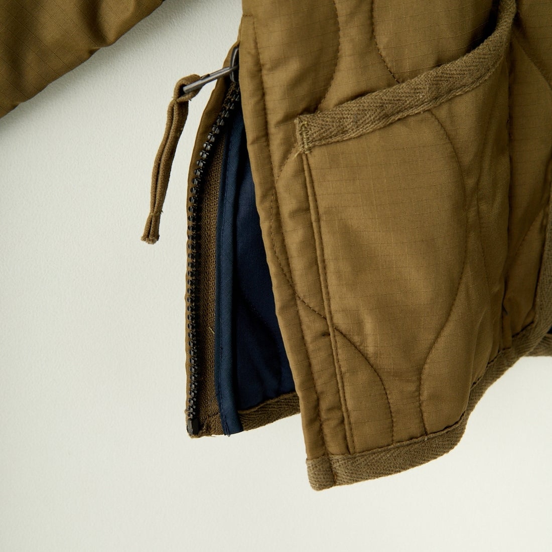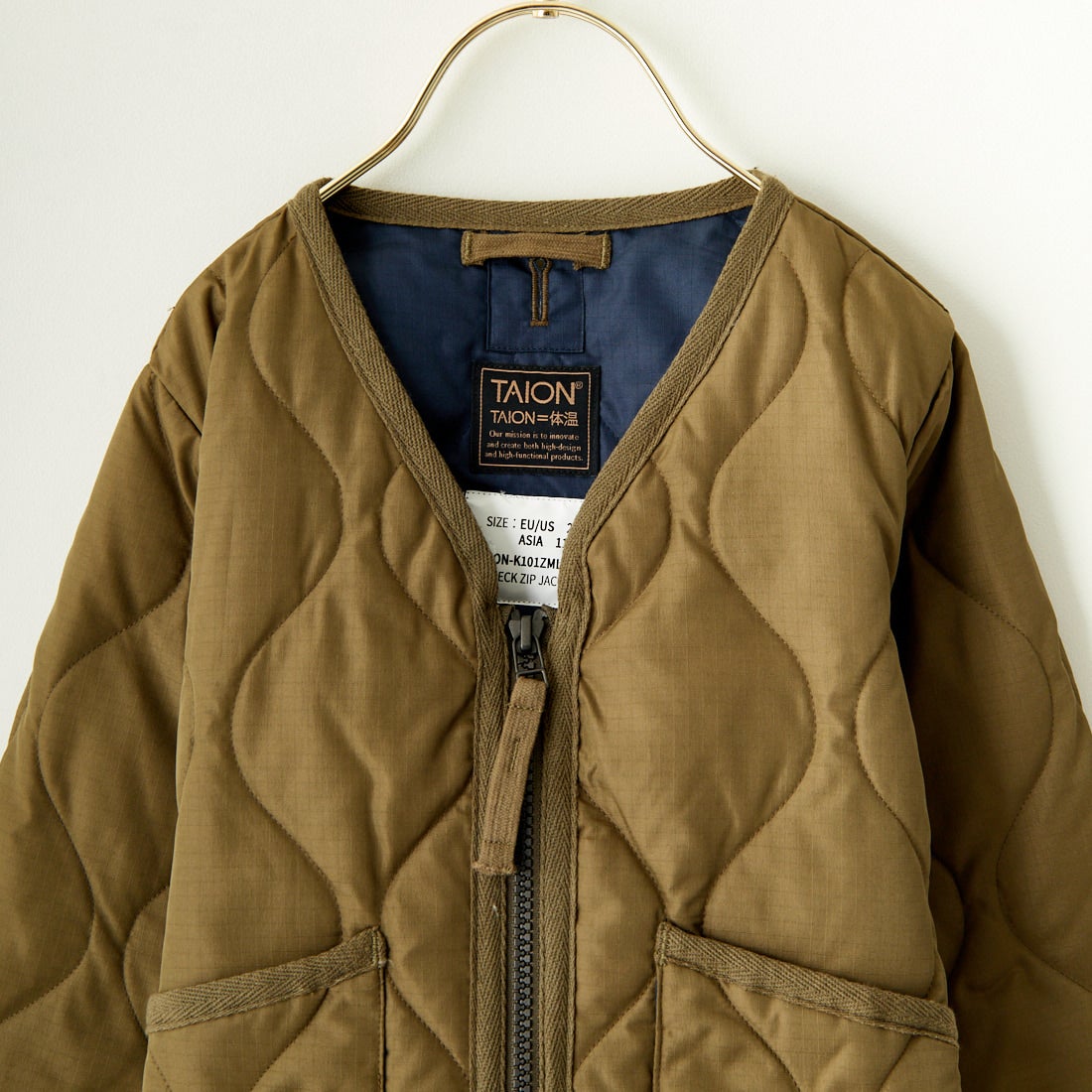 TAION[タイオン]のキッズミリタリー Vネックジップダウンジャケット。ミリタリーをモチーフにしたインナーダウンを取り揃えたMILITARY LINEから、キッズサイスのジップダウンジャケットが登場。ダウンカーディガンのような感覚で気軽に羽織れる着回しやすいデザインが特徴です。前たてダブルジップはスリットとしてコーディネートのアクセントに最適です。両脇スリットファスナーは可動域が増えることで動きやすくなり、ボトムのポケットにアクセスしやすく、重ね着もお楽しみいただけます。コンパクトに収納ができるパッカブル仕様で、外出時や旅行時にも重宝するアイテムです。